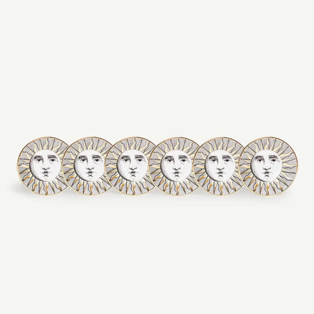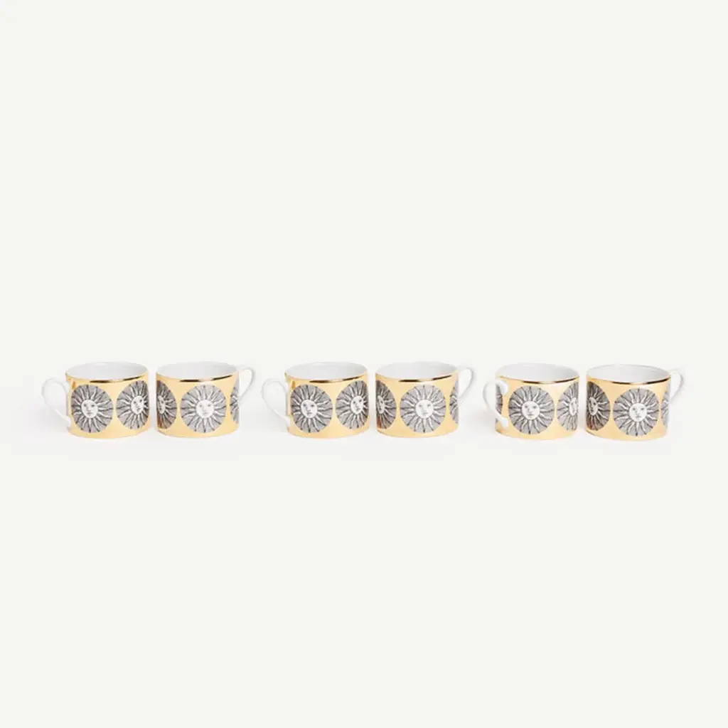 The sun occupies a privileged place in Fornasetti's imagination and is one of the main decorative themes of the Atelier: here it is the protagonist of this set of hand-decorated porcelain tea cups with gold accents. Any minor discrepancies between similar creations are the result of craftsmanship and attest to the uniqueness of each product.