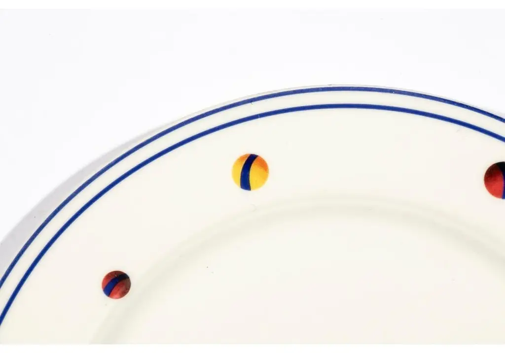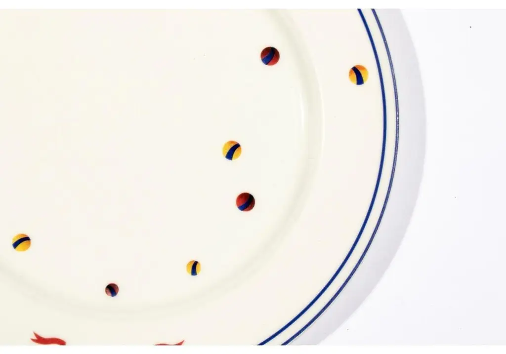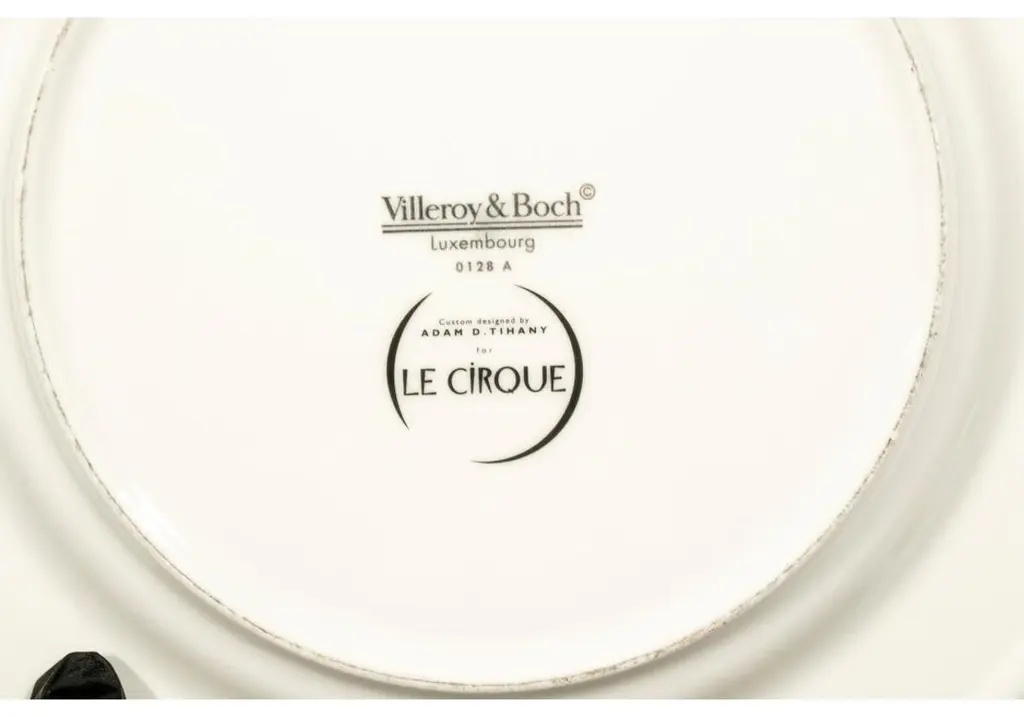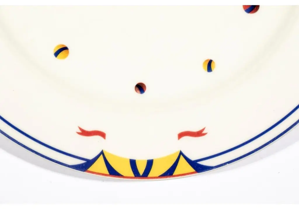 Set of 6 porcelain plates designed by Adam D. Tihany for Le Cirque and made by Villeroy & Boch. The plates are decorated with yellow circus big tops flying red flags and scattered colorful balls with double blue trims. Marked on verso "Custom Designed by Adam D. Tihany for Le Cirque"; Villeroy & Boch, Luxembourg.Dimensions: 11 1/2" W x 1" HCondition: moderate glaze wear and scratches consistent with restaurant use. No chips or cracks.