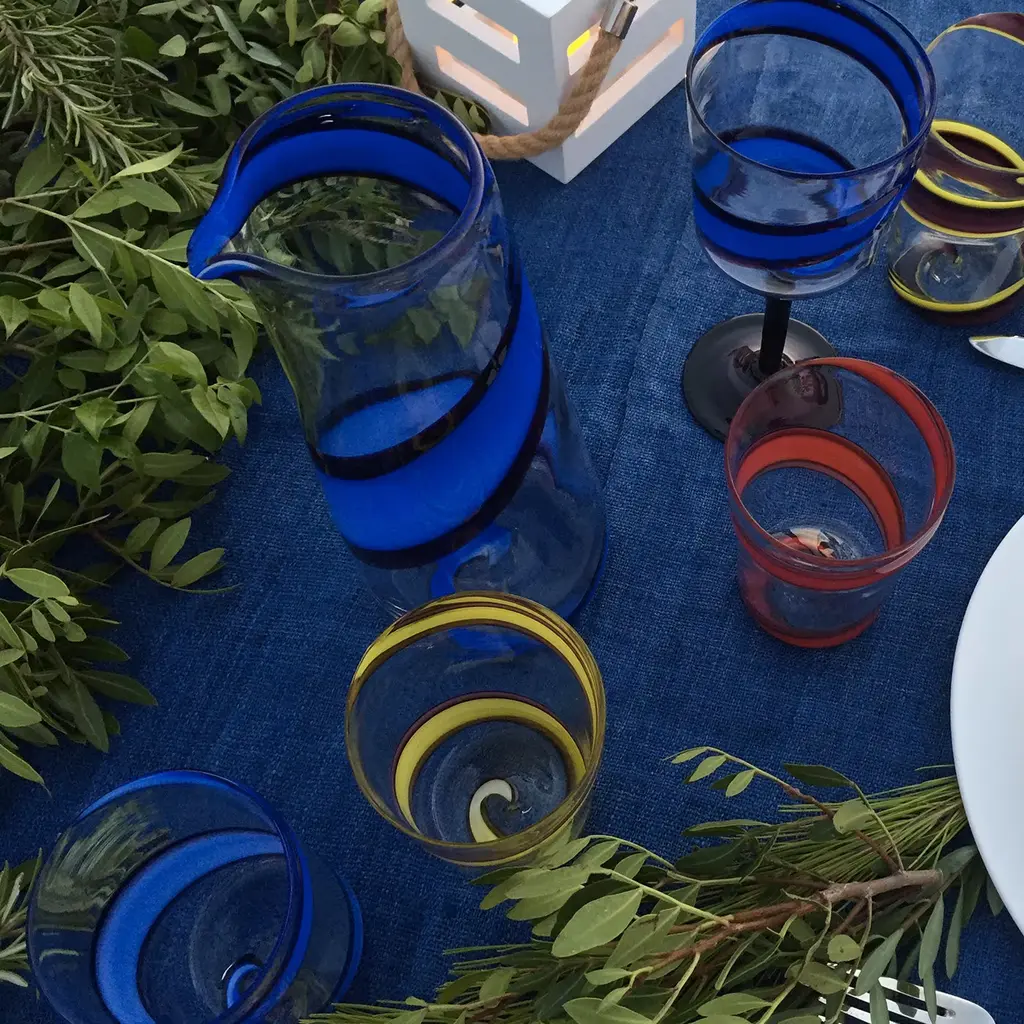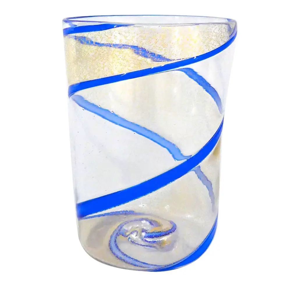 This stunning 24k Gold mouth-blown Murano glass boasts an exquisite decoration that will enliven any occasion. Elegantly combining gold and red, a ribbon curls on the surface of the transparent glass, generating a vortex - hence the name of the collection - that adds a luxurious color to the piece. Either alone, or combined with others hues in the same series, this glass will add a striking decoration also as unique vase for a small floral display. Due to the artisanal methods used in the production of this piece, there might be slight imperfections, marks of true craftsmanship.