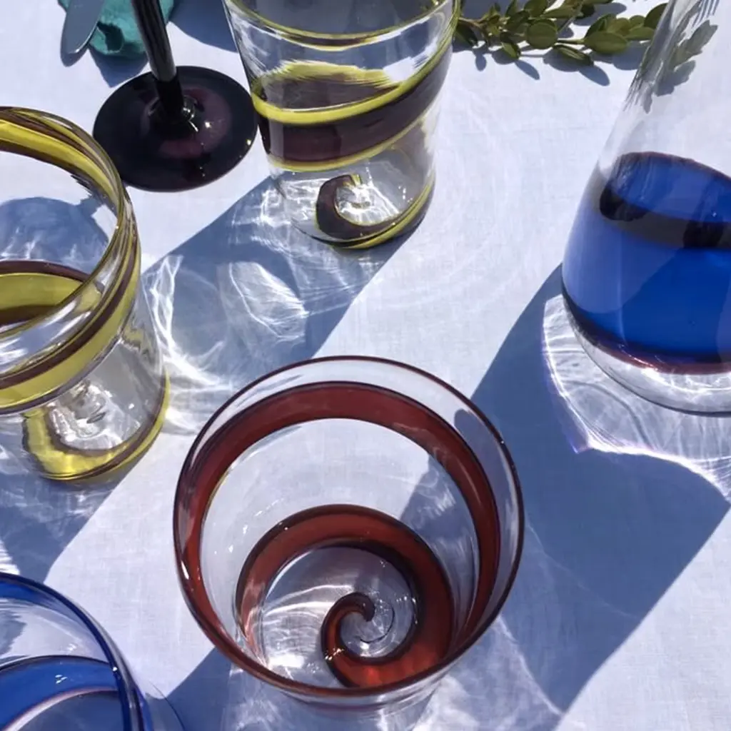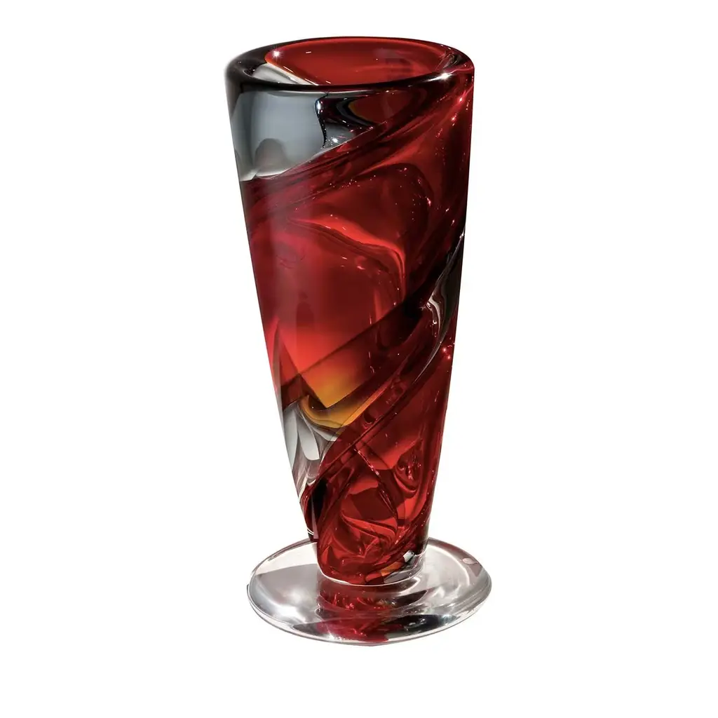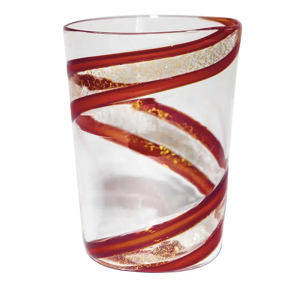 This transparent Murano glass was mouth-blown in a conical shape that measures 6 cm at the base and 8 cm at the mouth. The simple silhouette of this piece is adorned with a ribbon that curls around it to create a stunning decoration in rich red and purple hues. The effect is fresh and elegant and will be suitable for a summer aperitif, an informal dinner, a toast among friends, or even to display a flower. The handmade nature in the production of this glass might create small imperfections and chromatic variations, to be considered natural characteristic of this item.