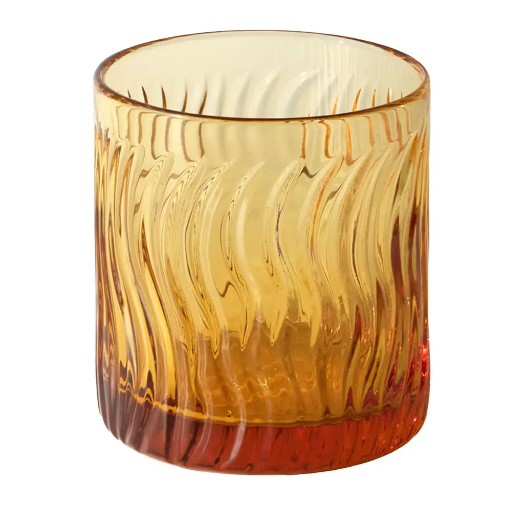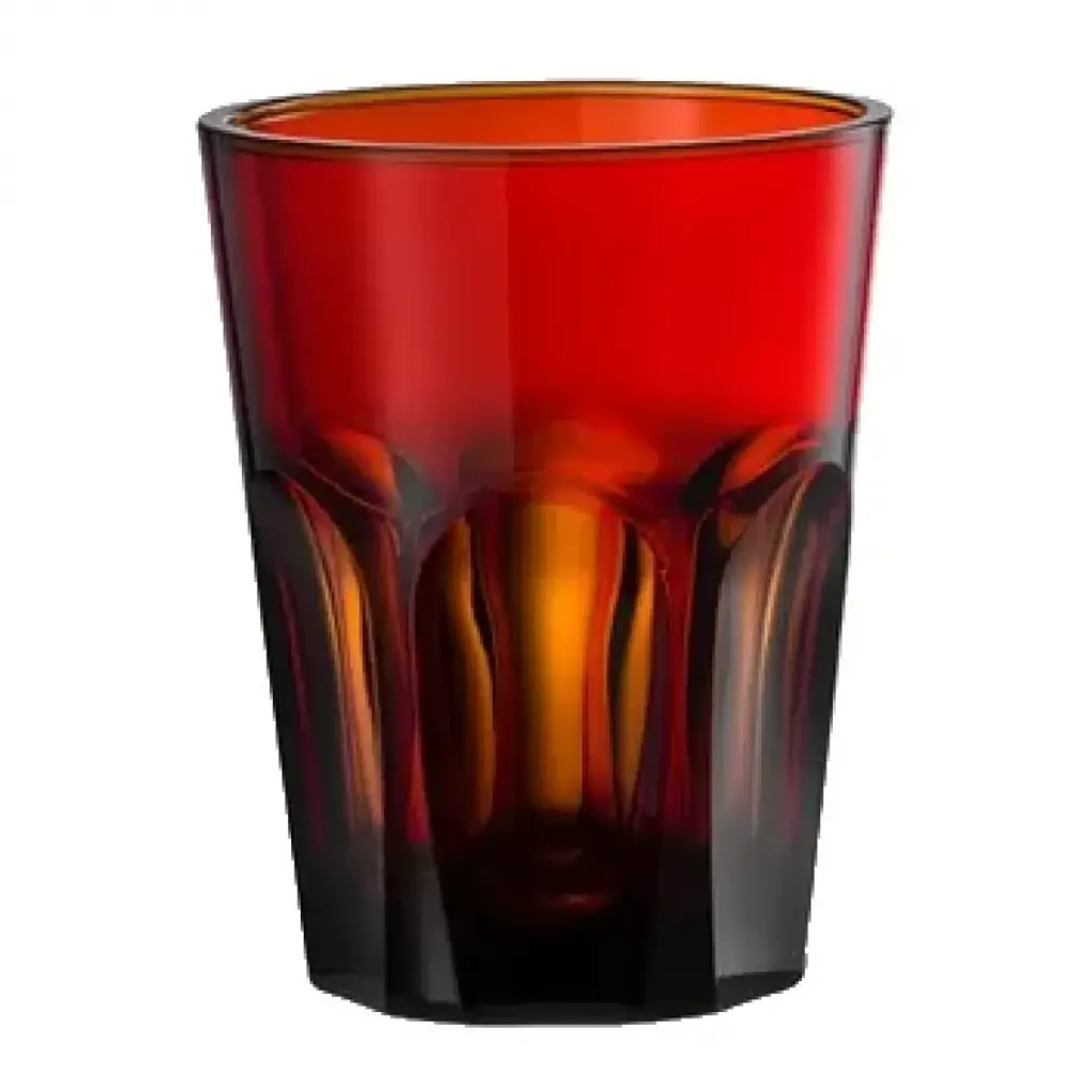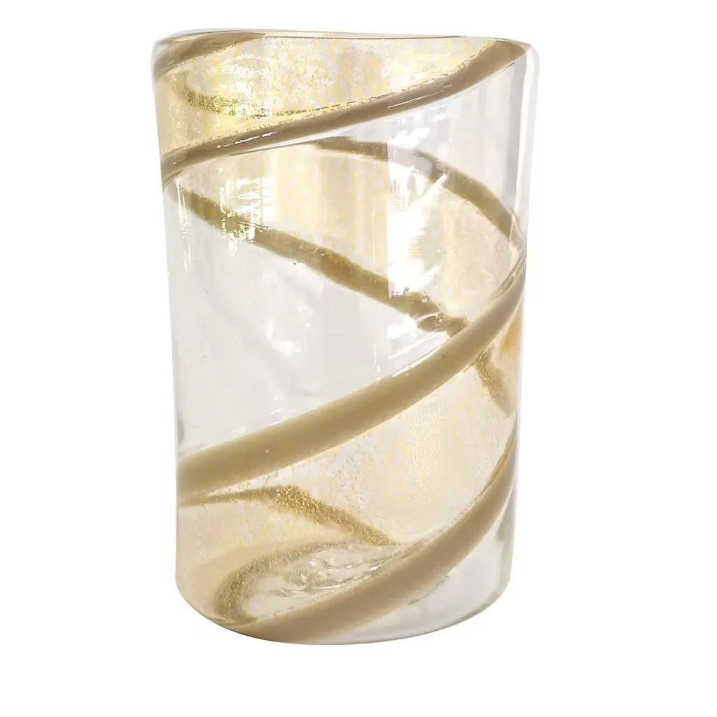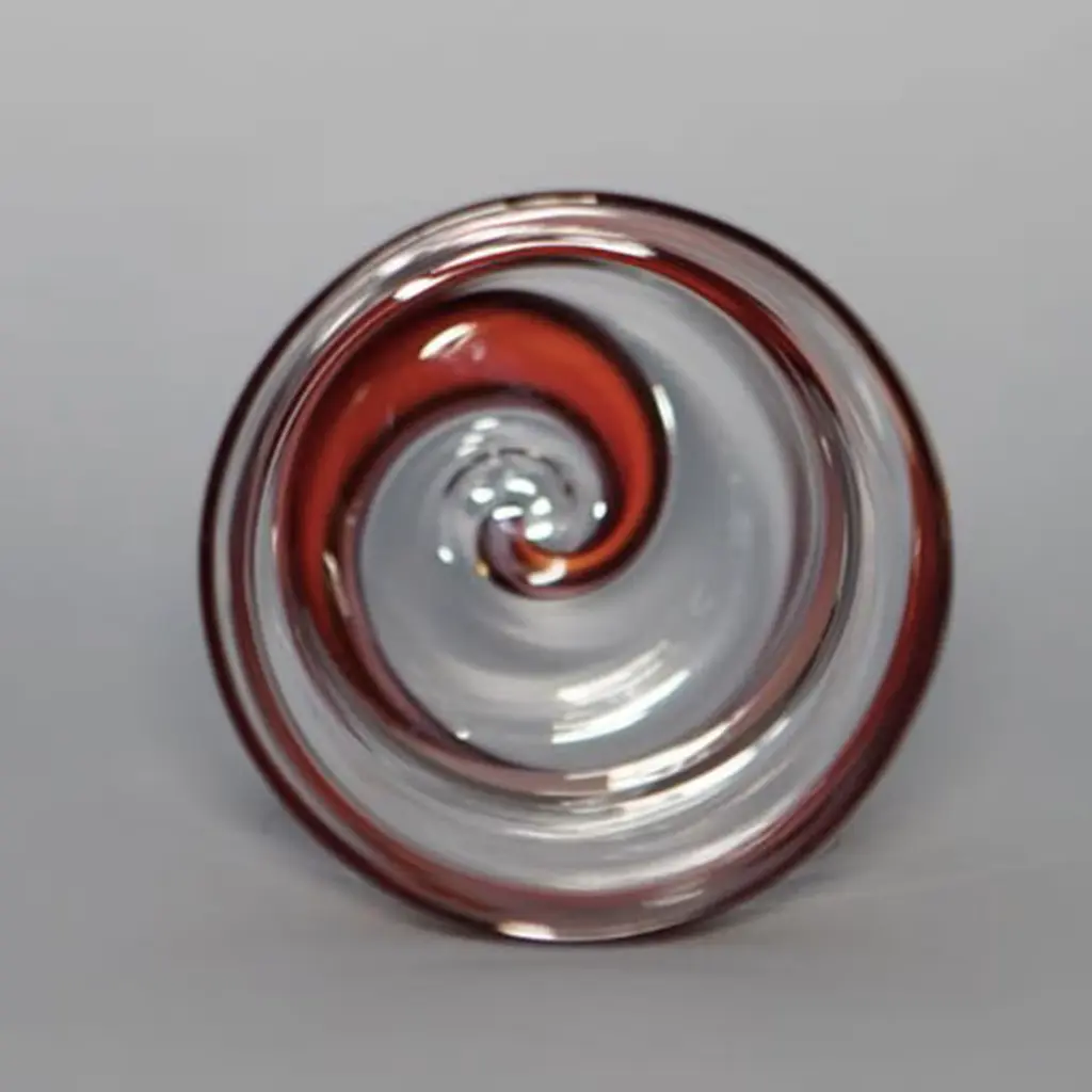 This transparent Murano glass was mouth-blown in a conical shape that measures 6 cm at the base and 8 cm at the mouth. The simple silhouette of this piece is adorned with a ribbon that curls around it to create a stunning decoration in rich red and purple hues. The effect is fresh and elegant and will be suitable for a summer aperitif, an informal dinner, a toast among friends, or even to display a flower. The handmade nature in the production of this glass might create small imperfections and chromatic variations, to be considered natural characteristic of this item.