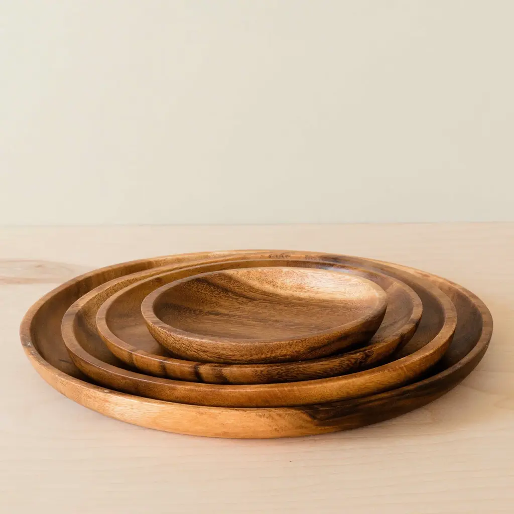 Elevate dinner with our richly grained acacia wood plate. Handcarved by artisans in the Philippines from sustainably sourced wood, they bring a natural homey vibe - perfect for everyday use or for hosting. Pair with other sizes to style as a set of two or three.Since each piece is handcarved from natural materials, please expect slight variations.