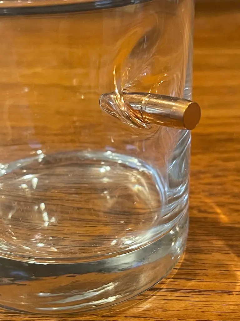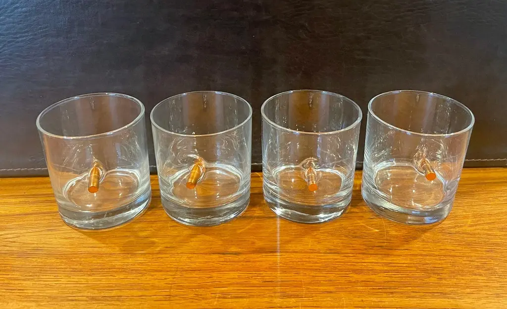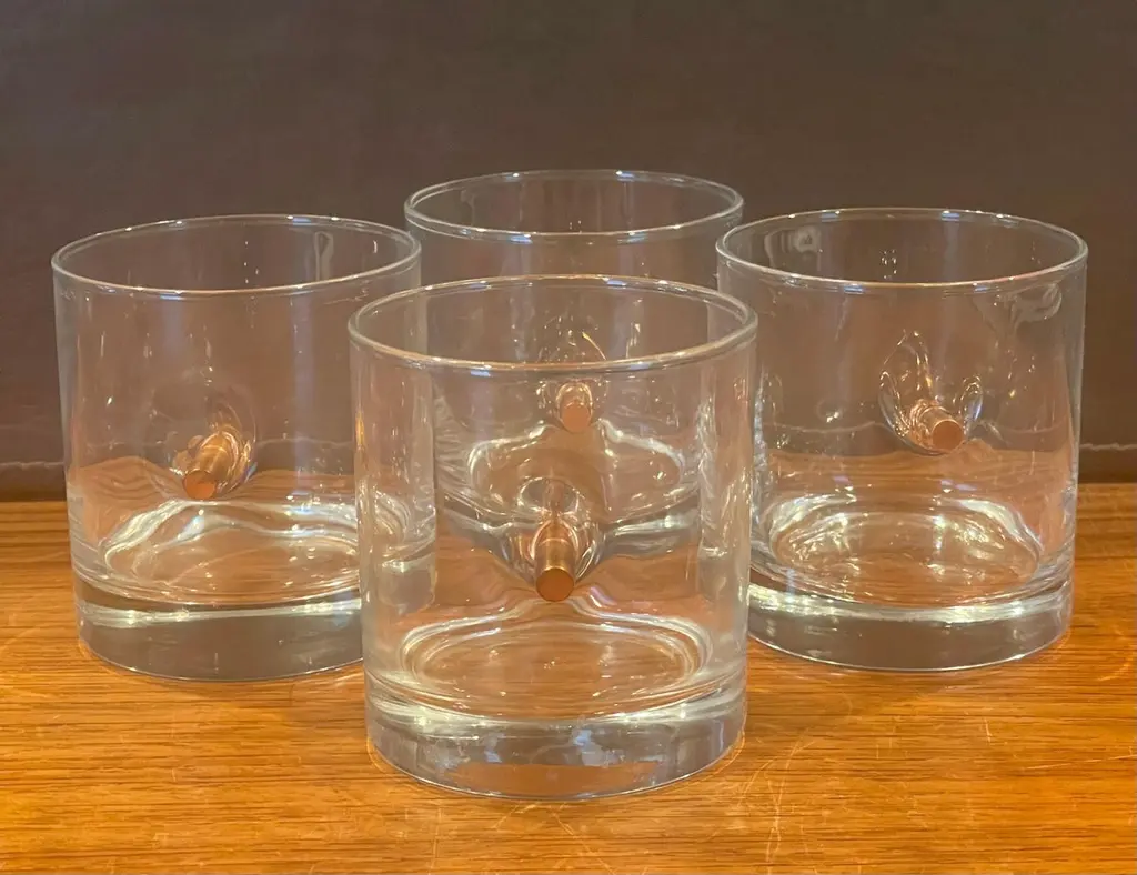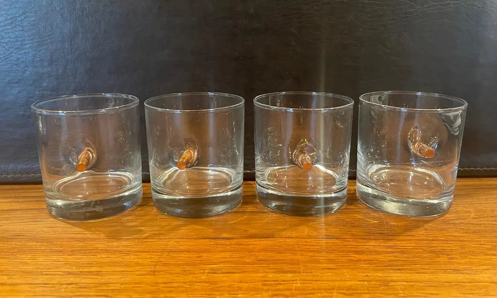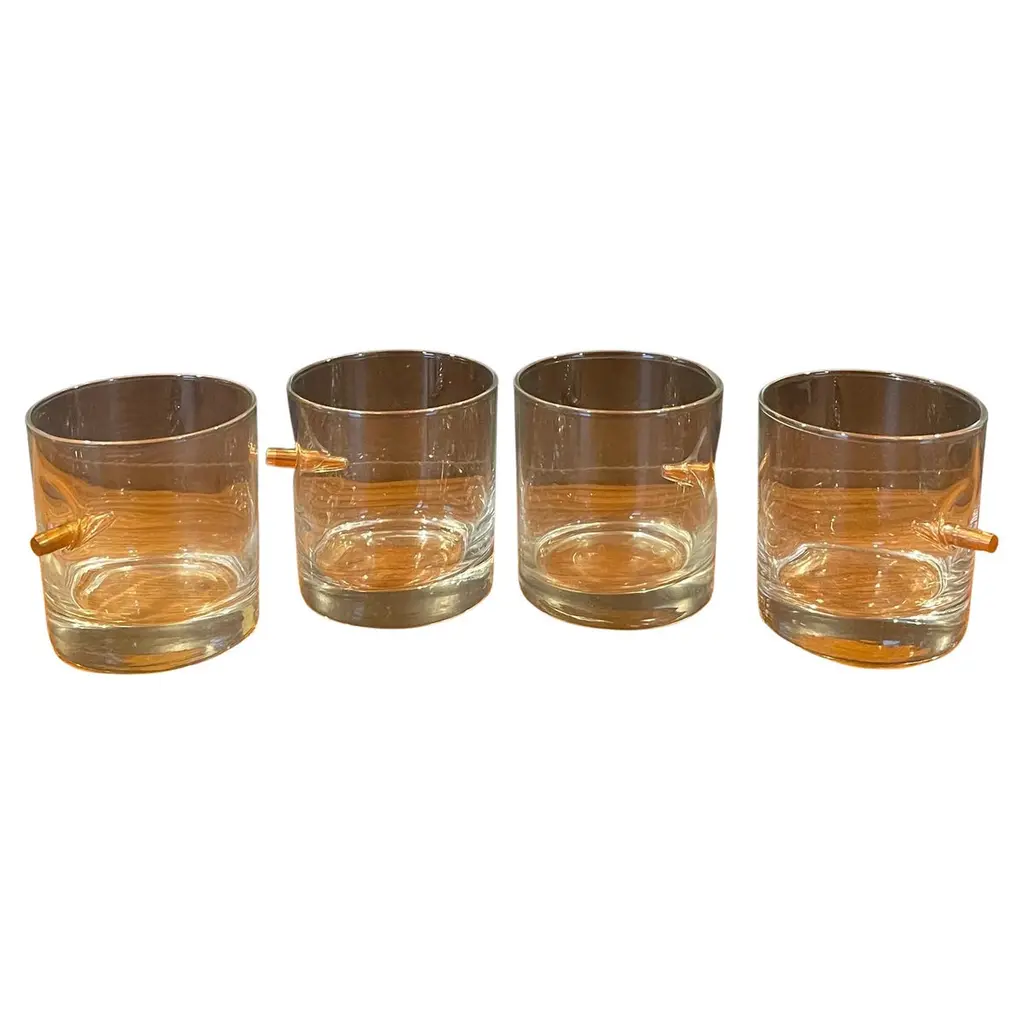 A very cool and unique set of four cocktail glasses with an exploding bullet penertrating the glass wall, circa 2000s. The glasses are in very good condition and each piece meassures 3.25"D x 3.5 H. They would make a great addition to any bar and a wonderful conversation starter! #2381