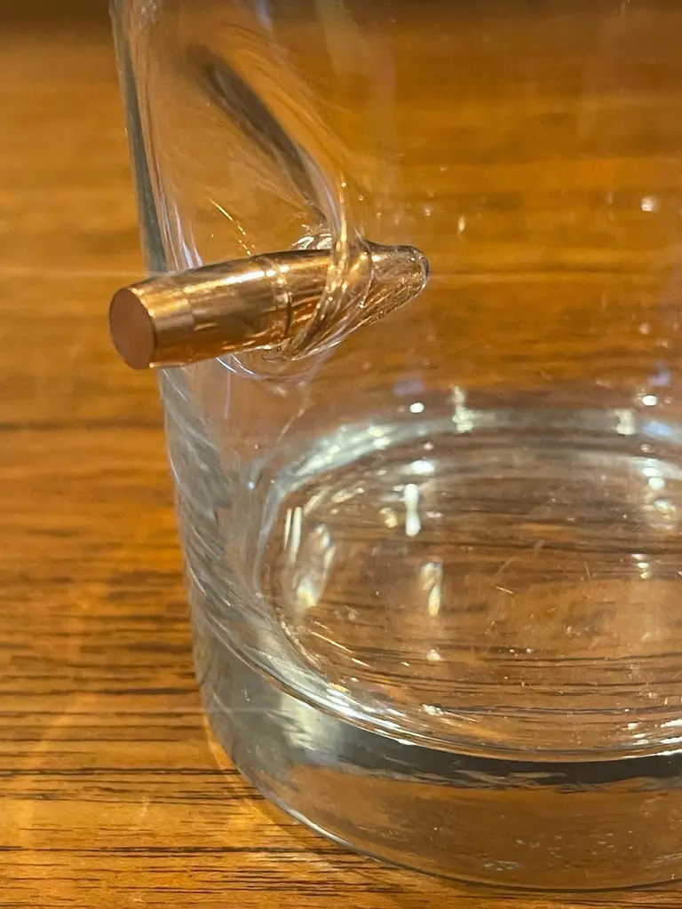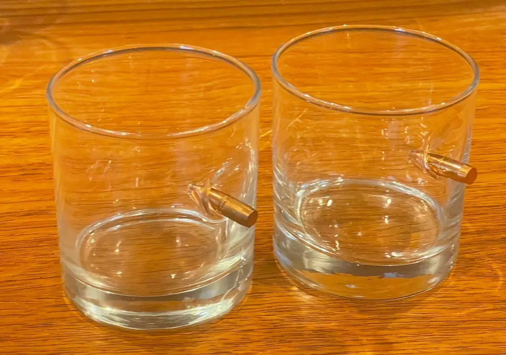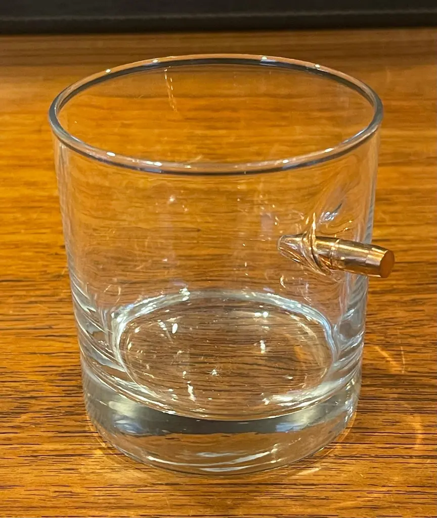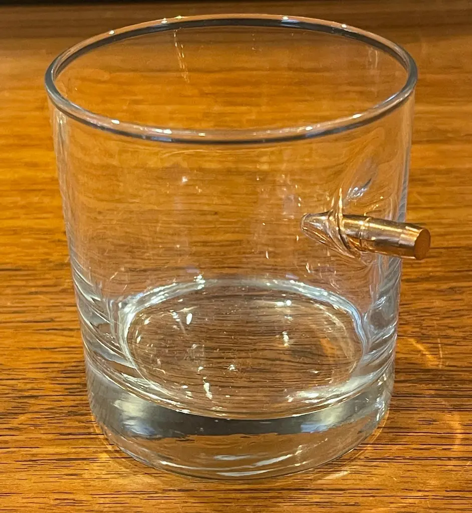 A very cool and unique set of four cocktail glasses with an exploding bullet penertrating the glass wall, circa 2000s. The glasses are in very good condition and each piece meassures 3.25"D x 3.5 H. They would make a great addition to any bar and a wonderful conversation starter! #2381