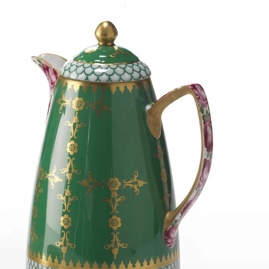 This practical set is exquisitely made in the finest porcelain with a vivid green finish. The elegant decorations are in pure gold. The six cups bear the same decoration as the thermos and have no handles.