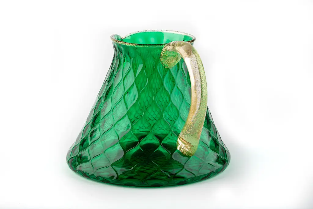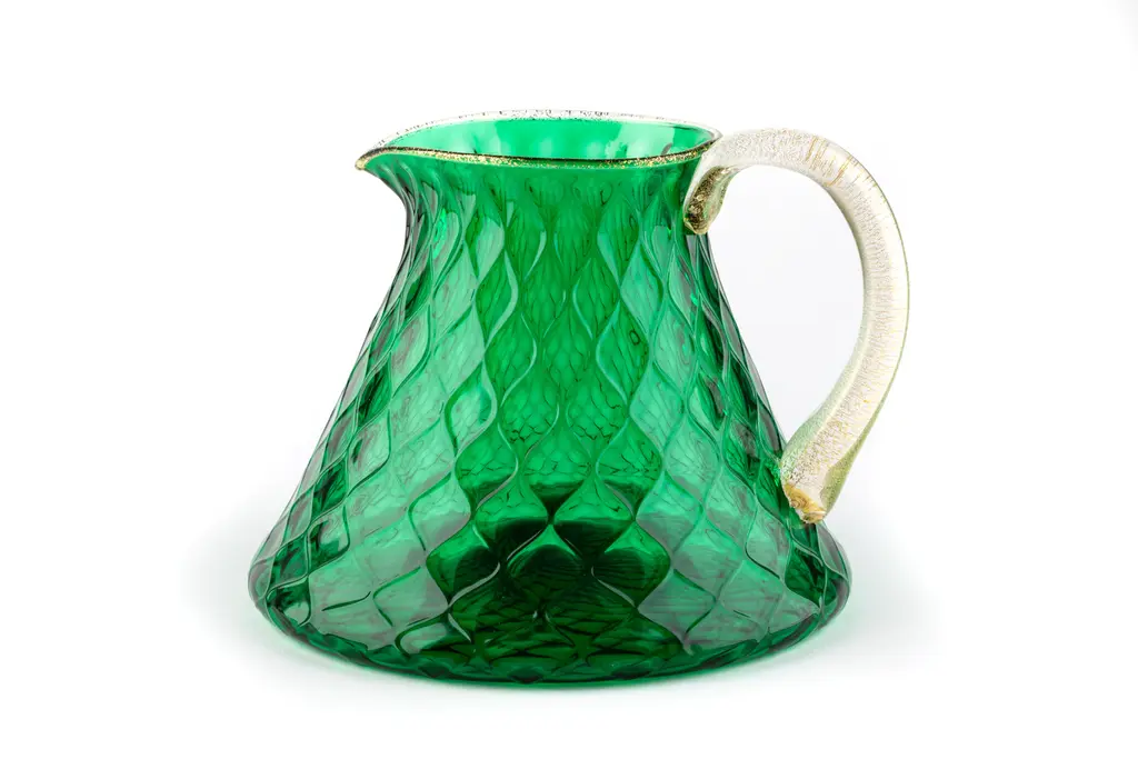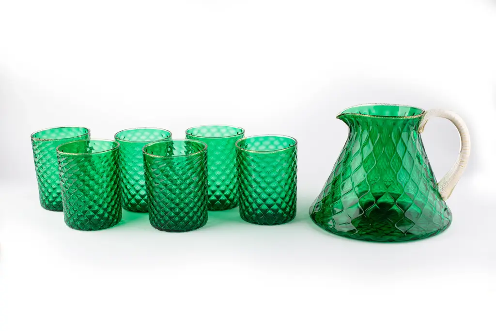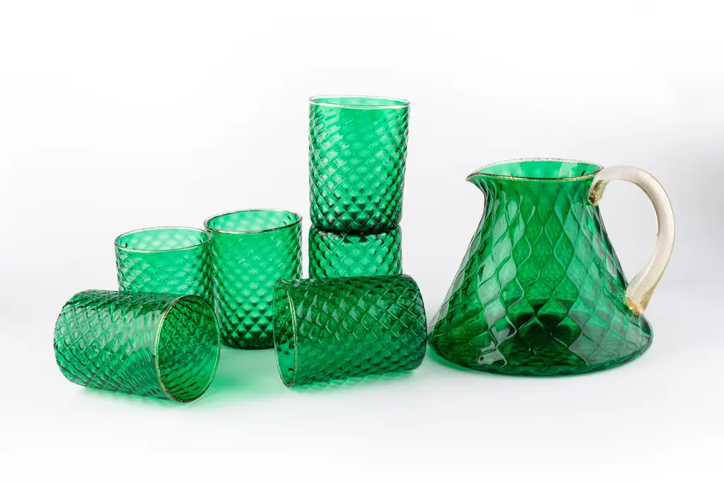 This captivating set of six water glasses with coordinate pitcher merges a simple shape with an enthralling "balloton" texture executed by Murano master glassblowers. This texture creates a pleasant tactile effect when holding the glass and is achieved with a traditional technique. A vibrant shade of emerald green completes the modern aesthetic of the set. Offered in other color options, please check with Concierge for details.