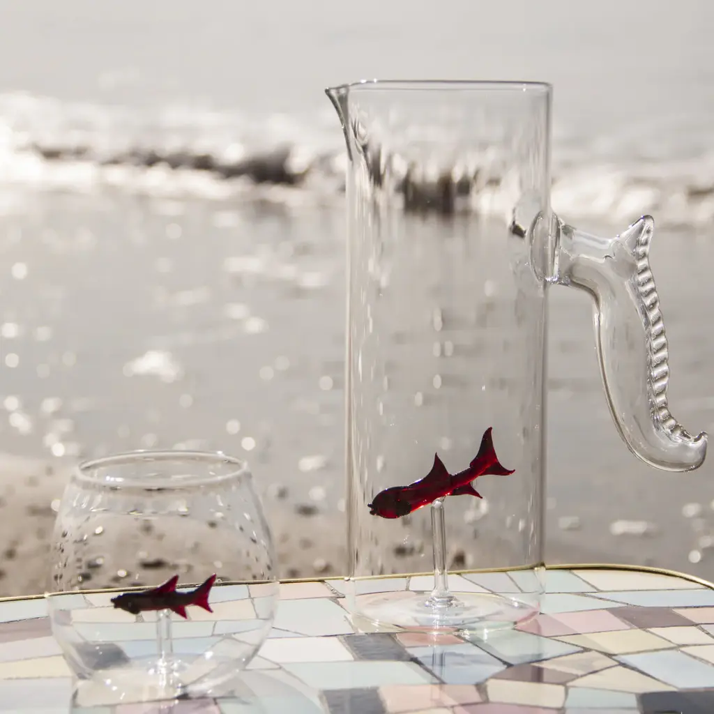 This little fish set will add a colorful and whimsical touch to any dining table. The tall transparent pitcher features a nautical handle and shares with the glasses the addition of an exquisitely rendered glass fish that seem to float thanks to a small glass support at their bottoms. The precise detail in these mouth blown pieces make this set truly unique.