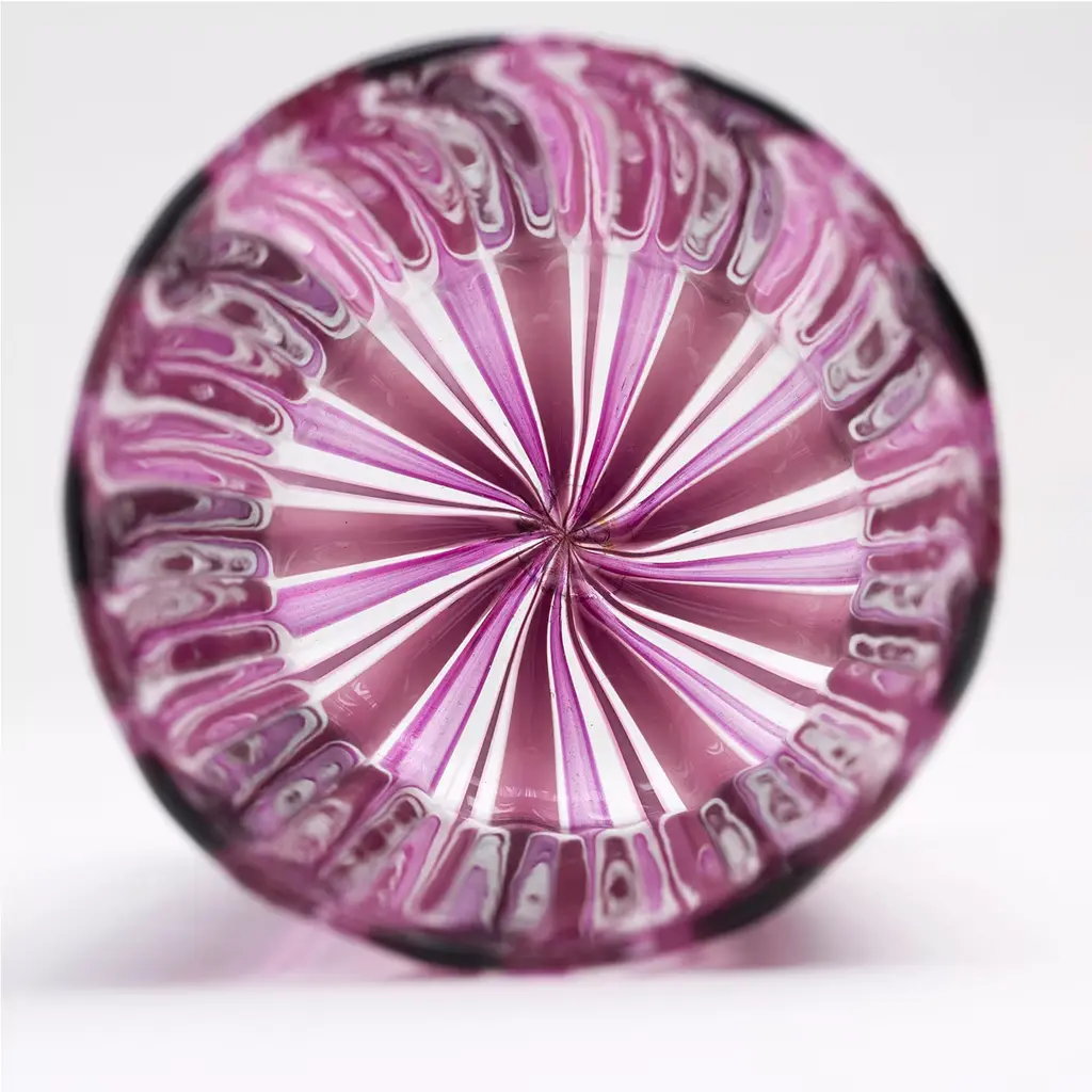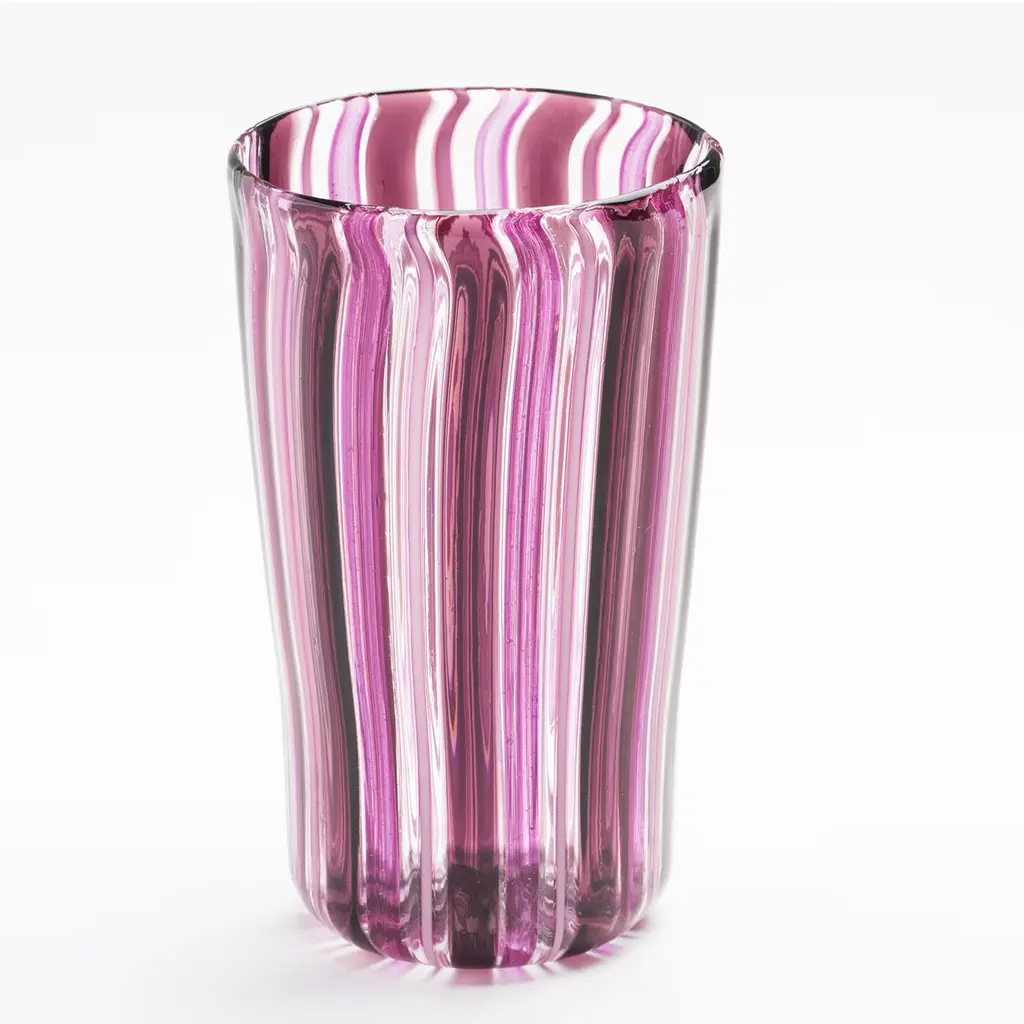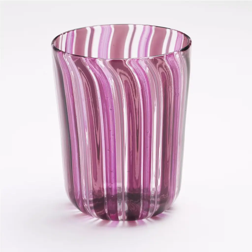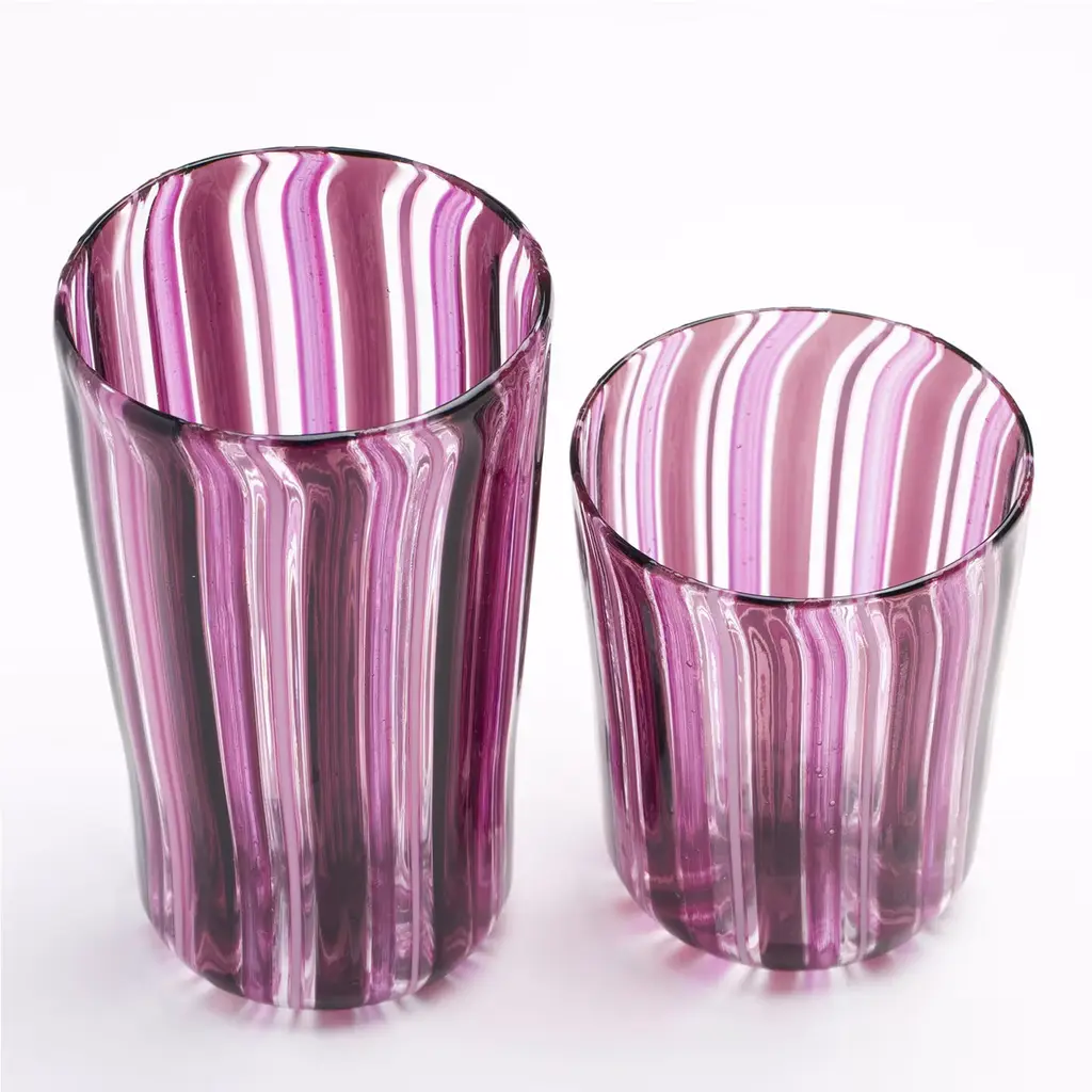 Set of 12 Murano glasses made with the "a Canna" technique, where canes of colored glass are melted into a clear glass base. This beautiful amethyst and pink set includes 6 water and 6 wine glasses entirely handcrafted on the Venetian island of Murano by the master glass blowers of La Fornasotta.