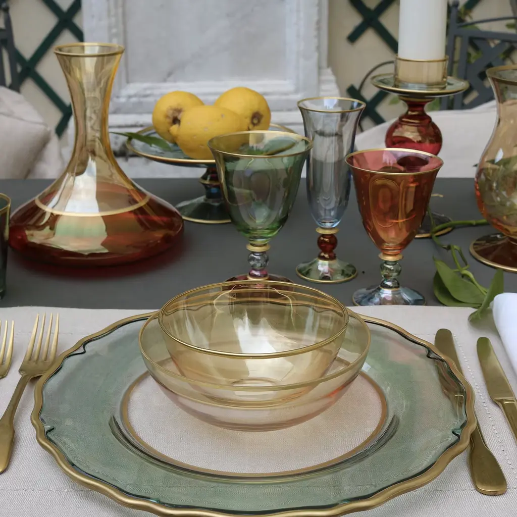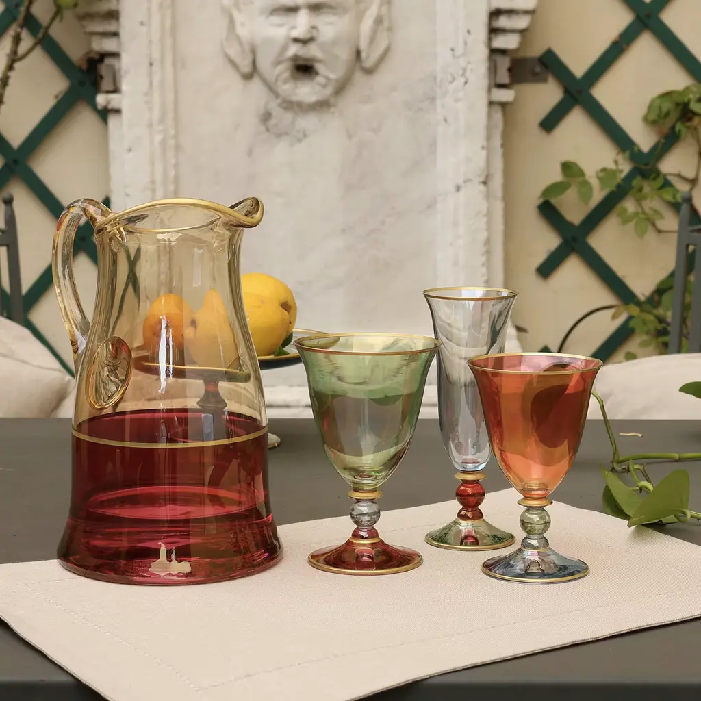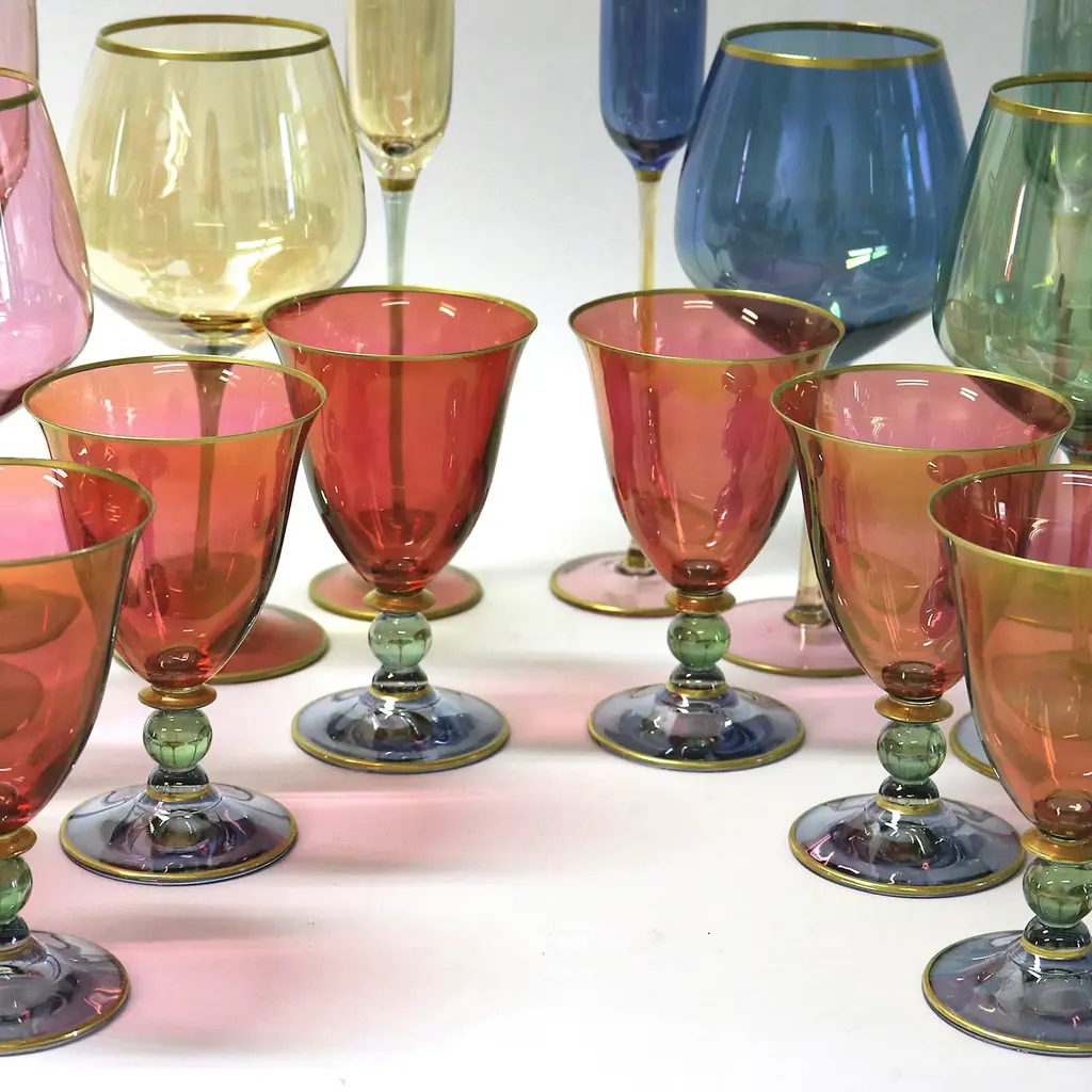 This set of six small chalices is part of the Arlecchino collection, that honors with vivid hues and exquisite craftsmanship the colorful masks of the Venetian carnival. In this case the pieces feature sinuous shapes and delicate curves, accented by a three-color combination that has a cup in deep red, a soft green ball on the stem, and a base in pale blue. Each element is highlighted with a hand-applied detail in pure gold.