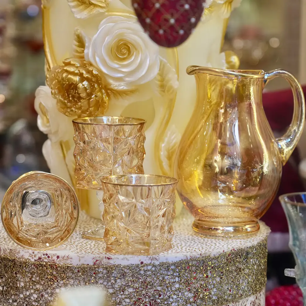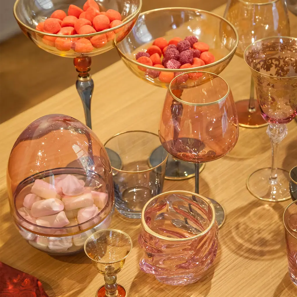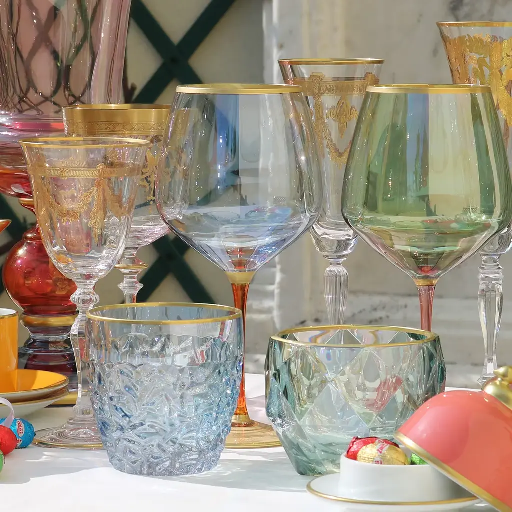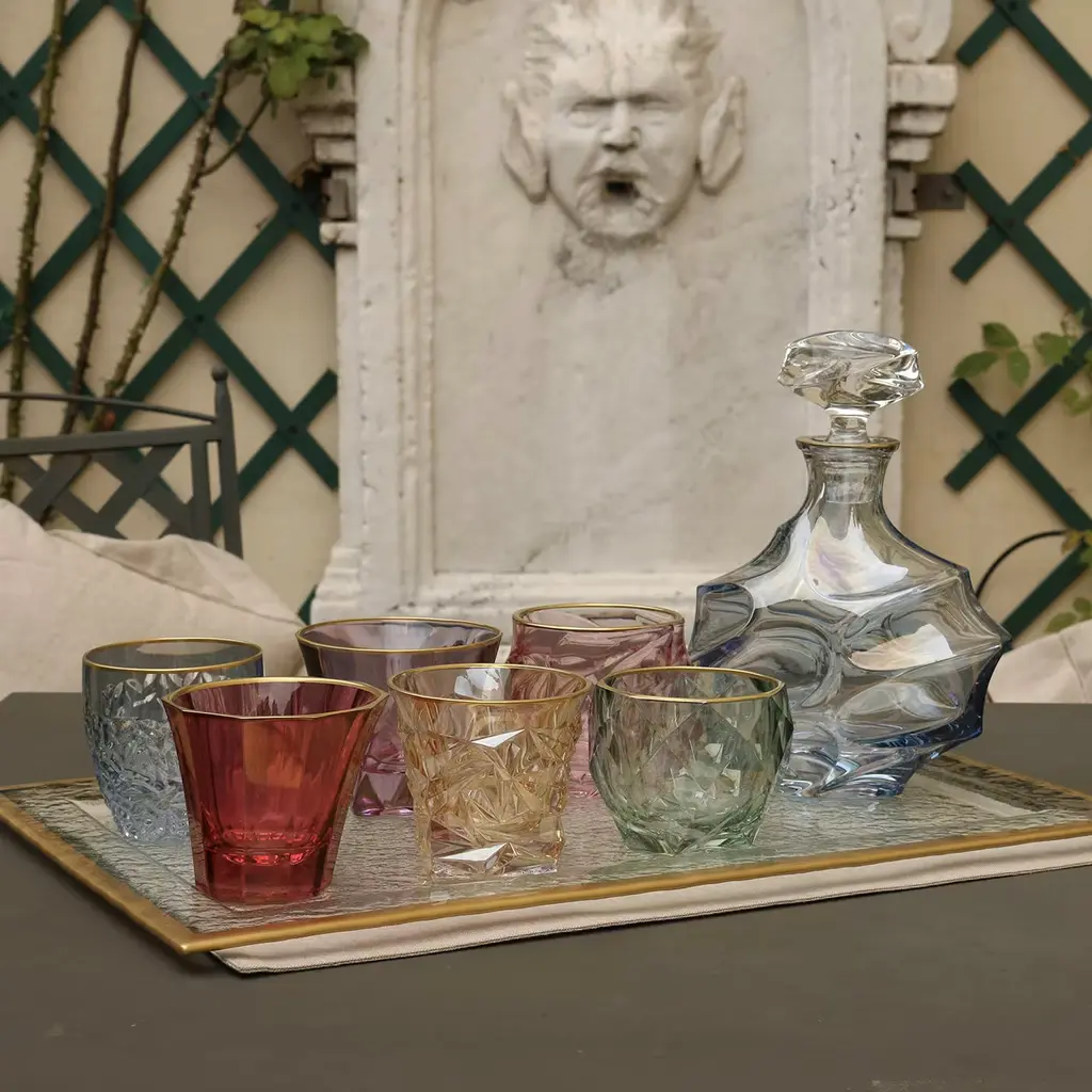 This set of six pieces features glasses of assorted shapes that were carved to create striking textures. The dynamic surface of each glass is highlighted by the use of a different color that was hand applied by expert artisans to create a delicate rainbow. The finishing touch is an accent in pure gold hand-applied to the rim of each piece, complementing the hues of the set. Either alone, or combined with the other pieces of the Six collection, this set will make a statement in any decor.