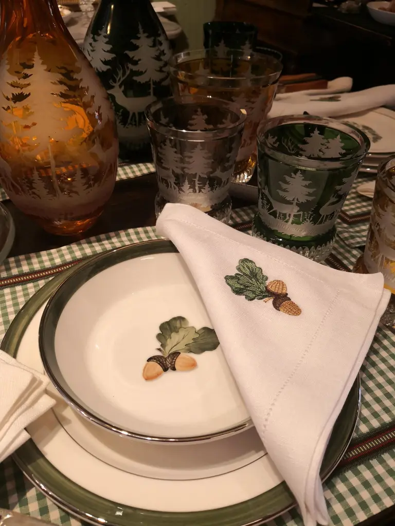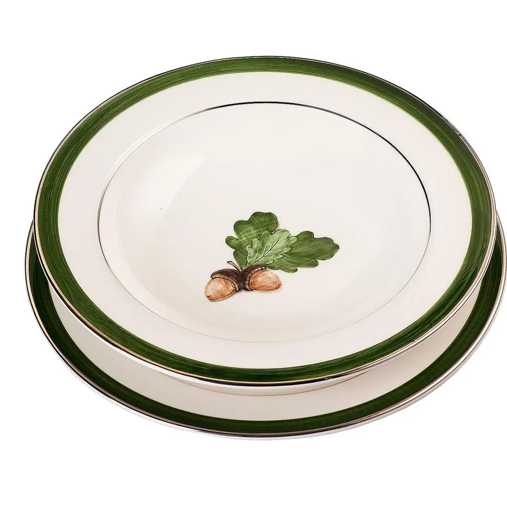Set of six completely handmade and hand painted underglaze porzelain dishes. The decor shows a black forest hands-free painted oak leaf with a green handsfree line and platinum rimmed. A matching soup plate and breakfast plate can be ordered in addition.The painting is dishwasher safe but not the platinum line. We recommend handwashing.About Sofina porcelain:The manufacturing of Sofina porcelain collection follows the 18th centuries styling. Starting from the sketching and creation of models made of plaster and the mold making. At the heart of Sofina lies a reversion to long-established craftmanship, quality and uniqueness. Every piece is hands-free painted in brilliant colors and refined with gold or platinum. Produced in Bavaria/Germany.
