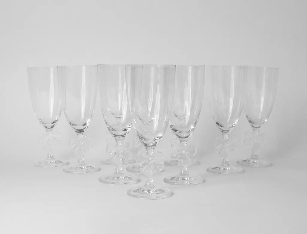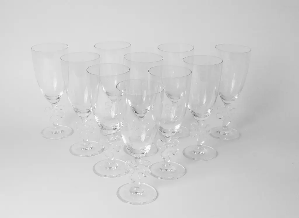 Large set of twelve Water glasses by Marc Auer. Whimsy and elegance crystal glass on jigsaw embellished stem. Acid stamped Marc Auerel.