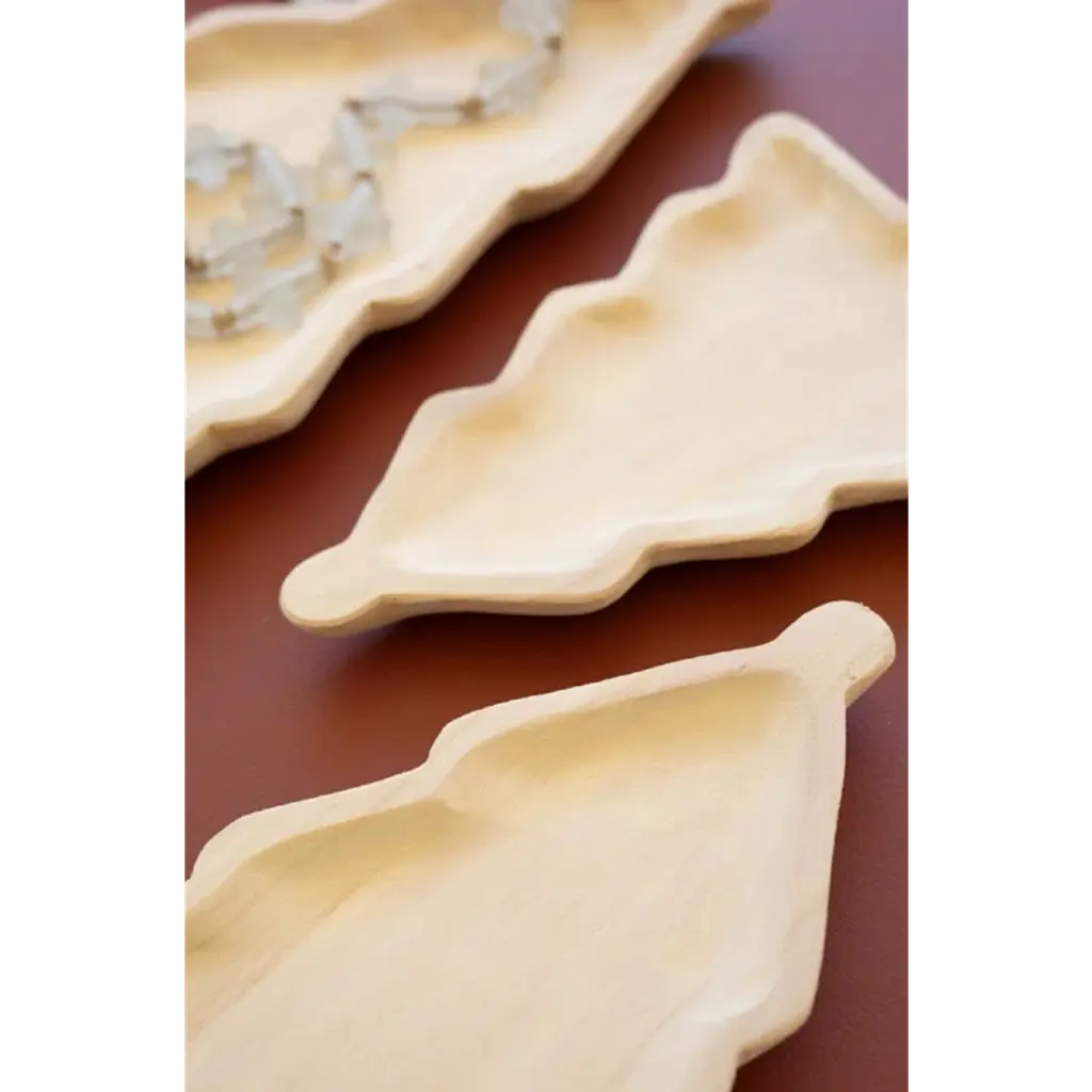 Use this set of three carved wooden Christmas trees for display or serving Line them up for a holiday buffet or let them shine full of ornaments as decor. Pair this set with other Christmas platters for a unique arrangement.