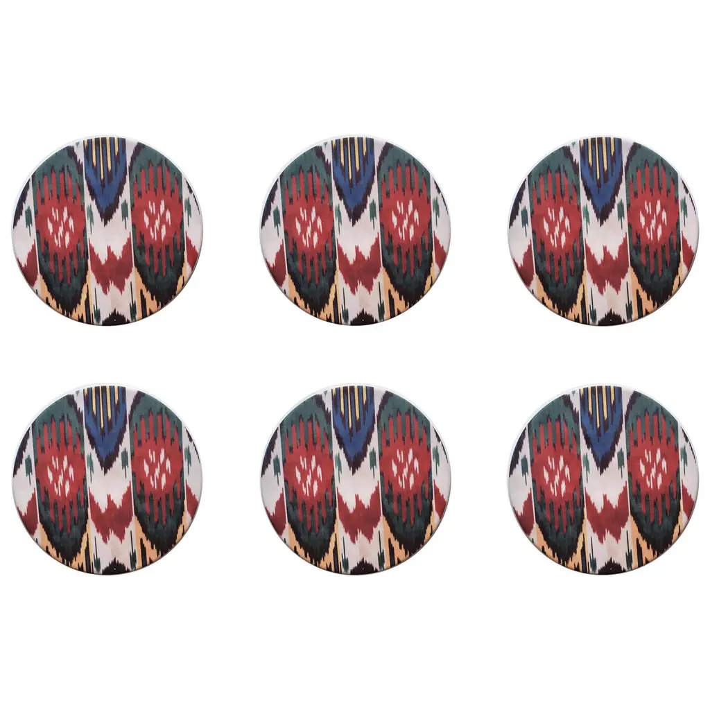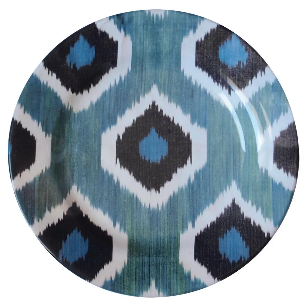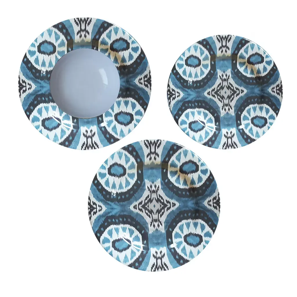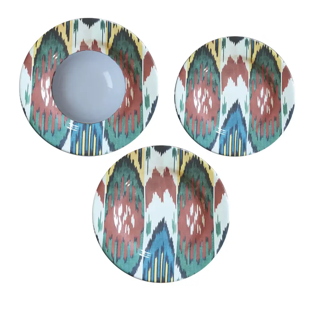 The Ikat design that graces this set of three plates is hand-applied decal. Made in Italy, according to Turkish décor, this set reproduces a design that traditionally belongs to fabric and brings it on the table where it will illuminate a dining room with its exotic motifs.