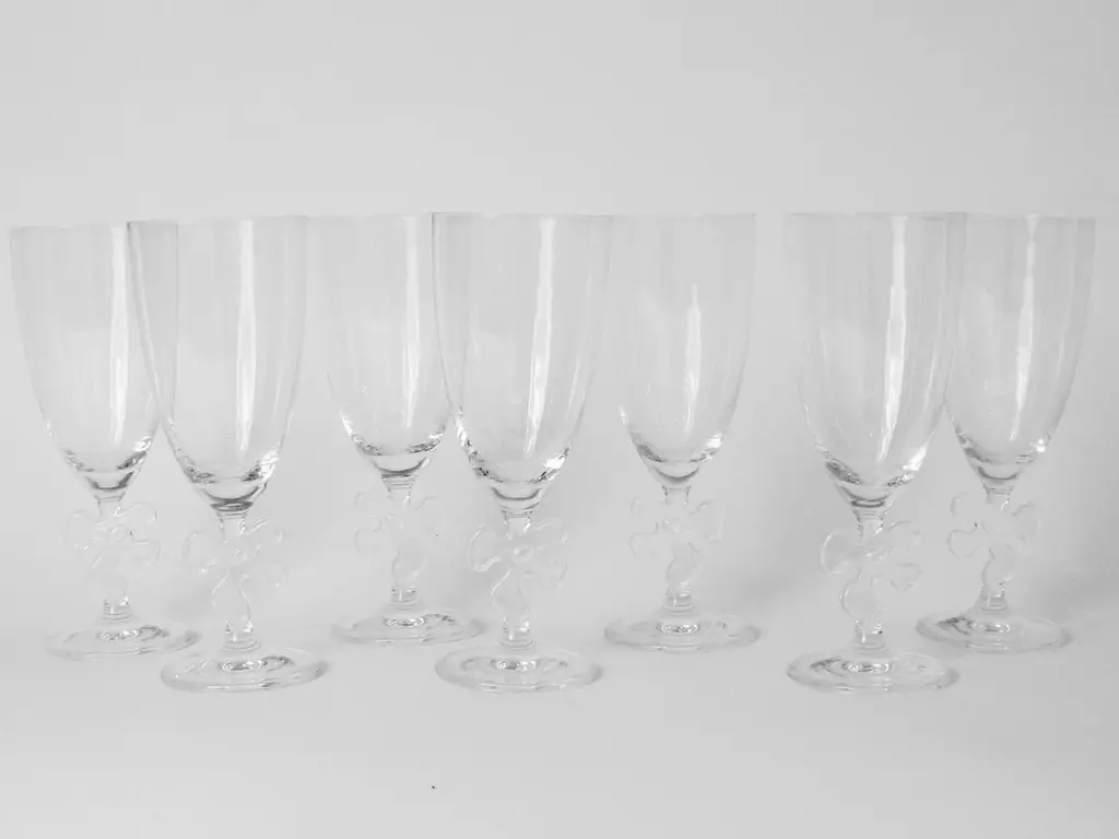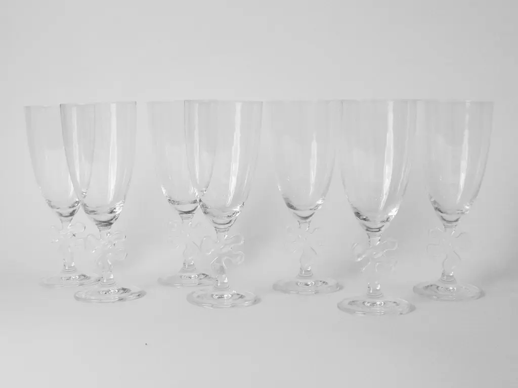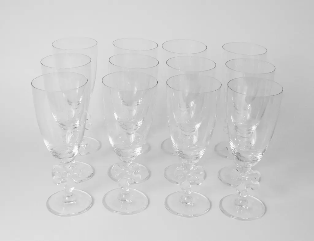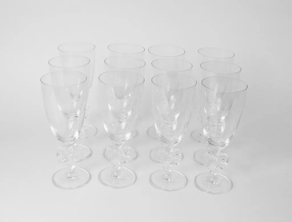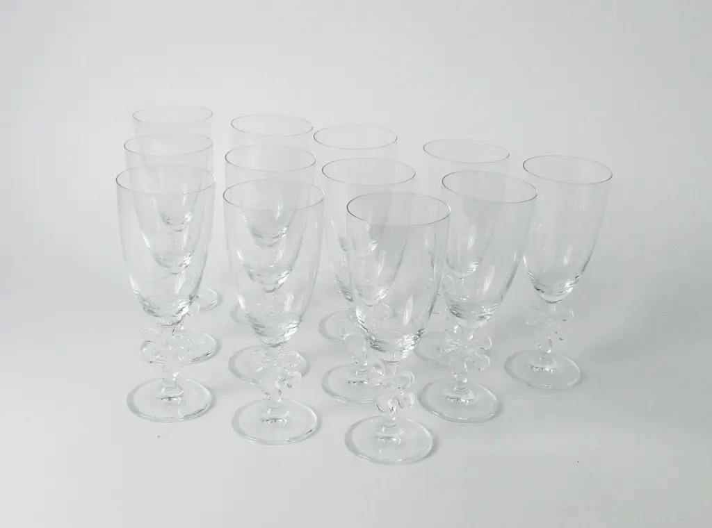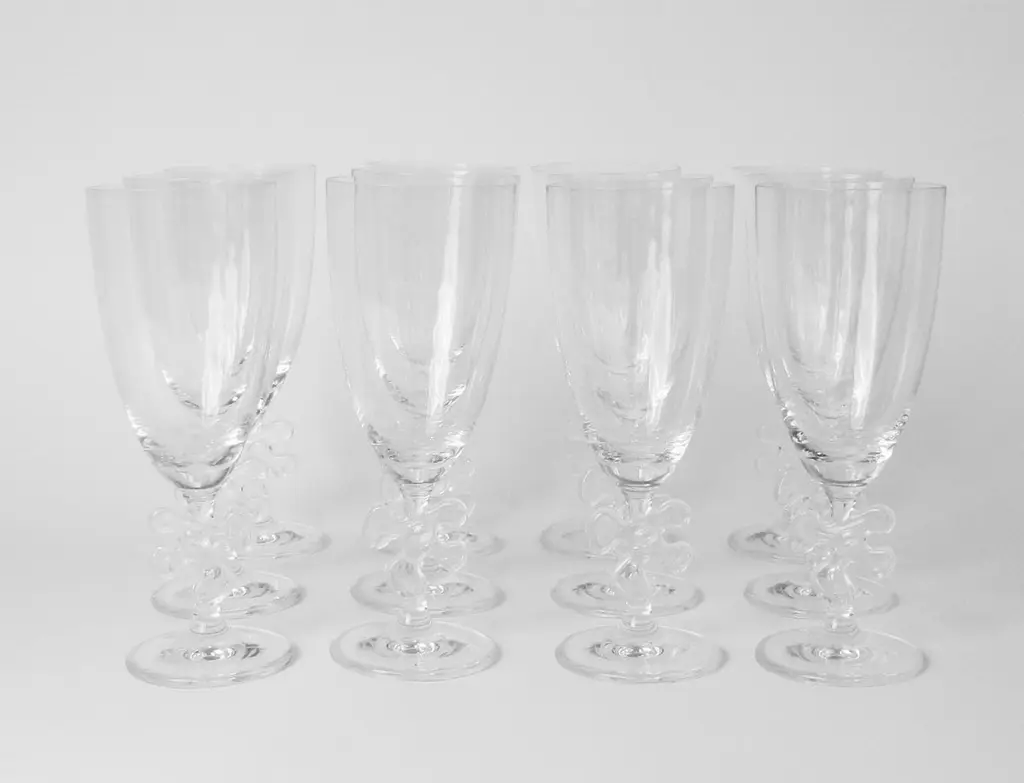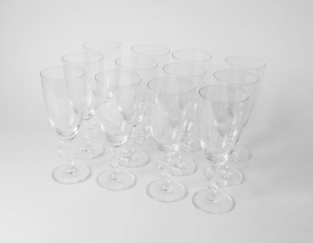 Large set of twelve Water glasses by Marc Auer . Whimsy and elegance crystal glass on jigsaw embellished stem . Acid stamped Marc Auer .