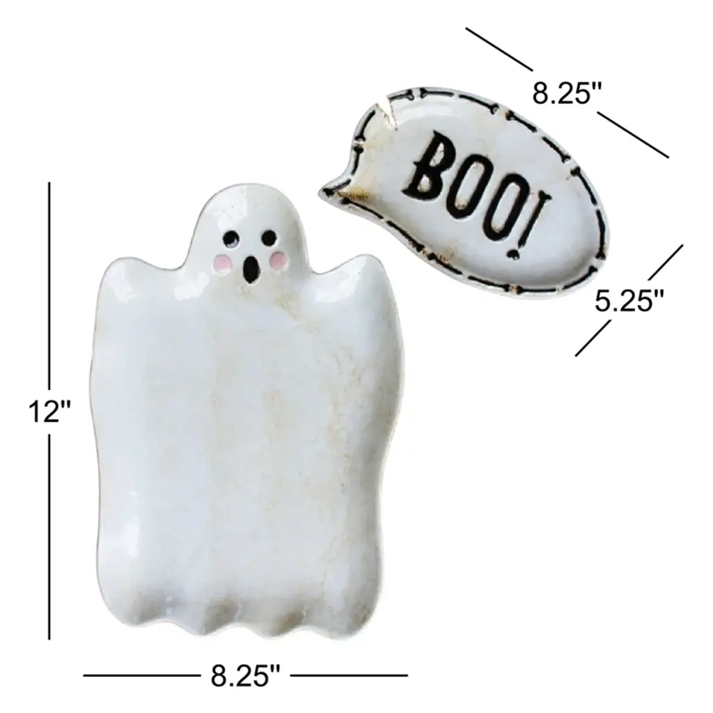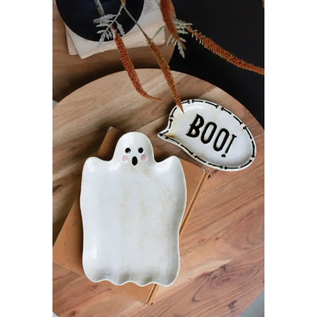 Boo to you! This ghost ceramic serving dish set of two features a scary ghost and his spooky word bubble. Use it to display Halloween treats or keep your candy close by.