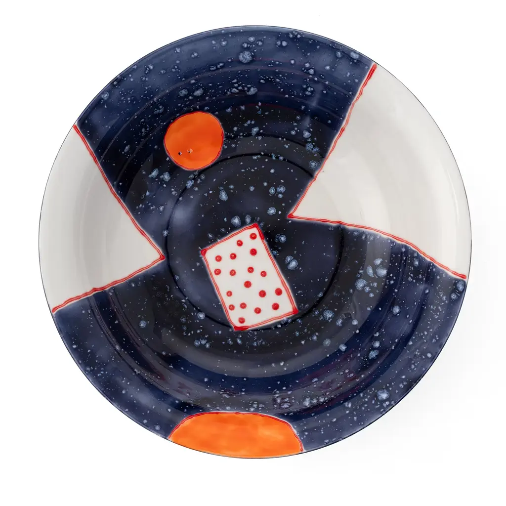 The Sierra Salad Bowl captivates with its deep, mysterious design, featuring a starry, dark background that evokes a sense of wonder. The vibrant orange accents create a striking contrast, bringing warmth and energy to the plate. Central to the design is a classic mountain figure, a signature element in Coralla's work, symbolizing strength and adventure. This unique combination of colors and imagery transforms each meal into an experience, making it perfect for both everyday occasions.
