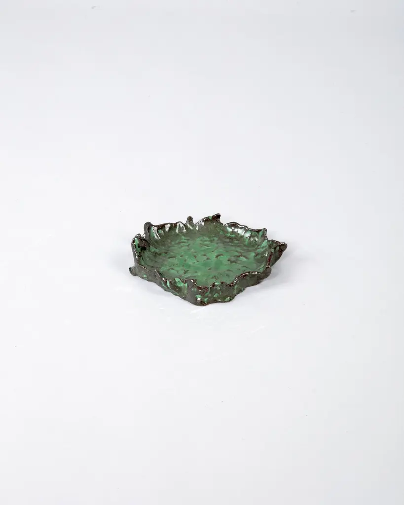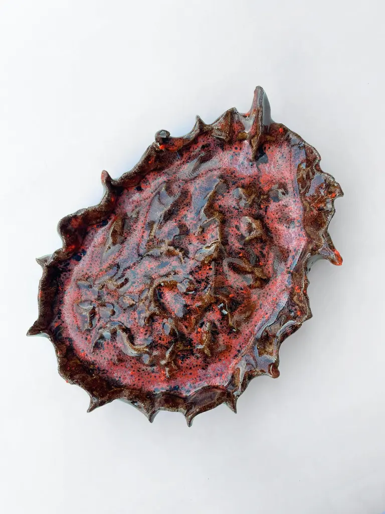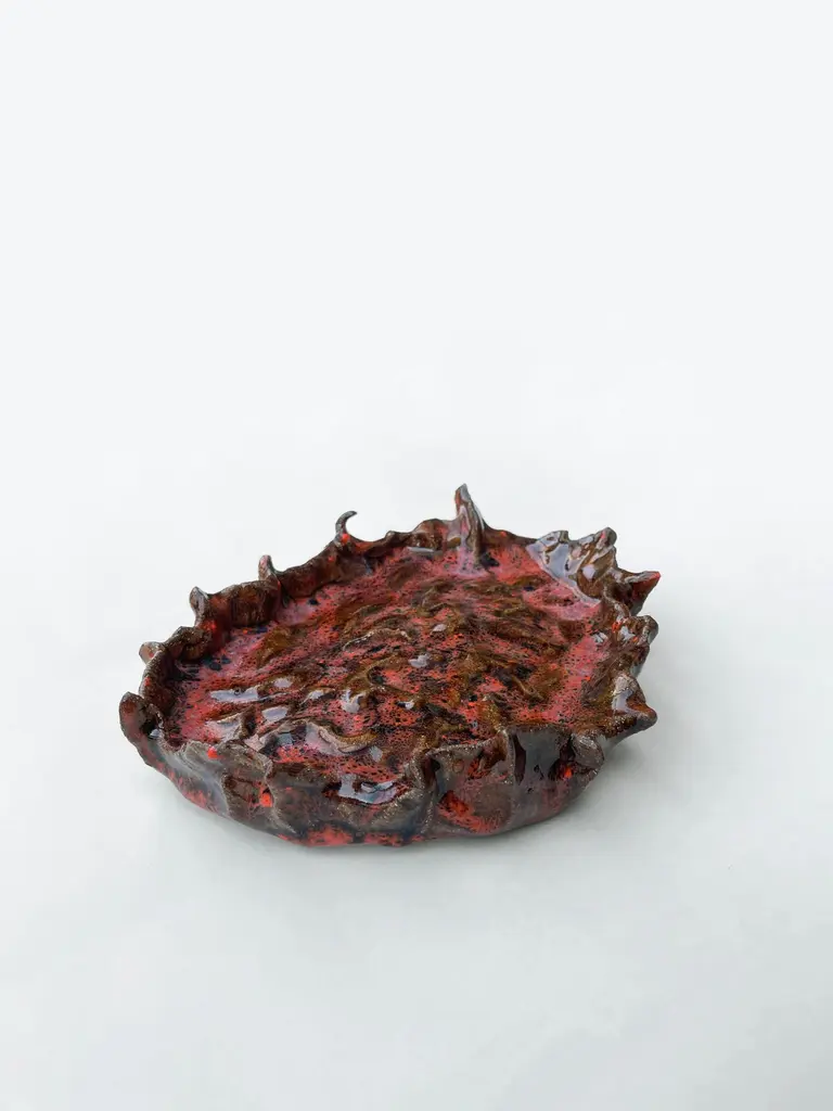 Silent fire plate by Daniel NikolovskiDimensions: ø18 x H 3 cmMaterials: Glazed ceramicThe concept behind this plate is capturing a chemical phenomenon - fire, and freezing it in time. Handmade by roughly sculpting a piece of clay, this object evokes subtle gestures of flames. Glazed in fire-y glossy and opaque glazings, this sculptural plate has many uses such as: plate for serving food, ashtray or simply use it as a storage of personal items.Daniel Nikolovski (1992) is a Macedonian-born interior and furniture designer, currently living and working in Milan, Italy. His work is narrative-driven and is characterised by the use of sculptural geometries, altering proportions, expressed through rich range of materials such as: steel, resin, tortoiseshell acetate, boldly-patterned woods and fabrics used in the fashion industry.An alumni of Istituto Europeo di Design (BA) - Milan and a graduate of the Royal College of Art (MA) - London, some of his past work experiences include: Creative Direction and Design for the furniture brand KABINET, Verona (2019), Set Design for the exhibition Designing Craft / Crafting Design, Vienna (2017), Interior Design for NCDA, Hong Kong (2015).Throughout his career, he has presented his work at Salone del Mobile, FIAC (Paris), Paris Design Week, Offsite Online (NY) and Vienna Design Week. Daniel’s work has been published in Elle Decoration, Marie Claire Maison, AD and The New York Times.
