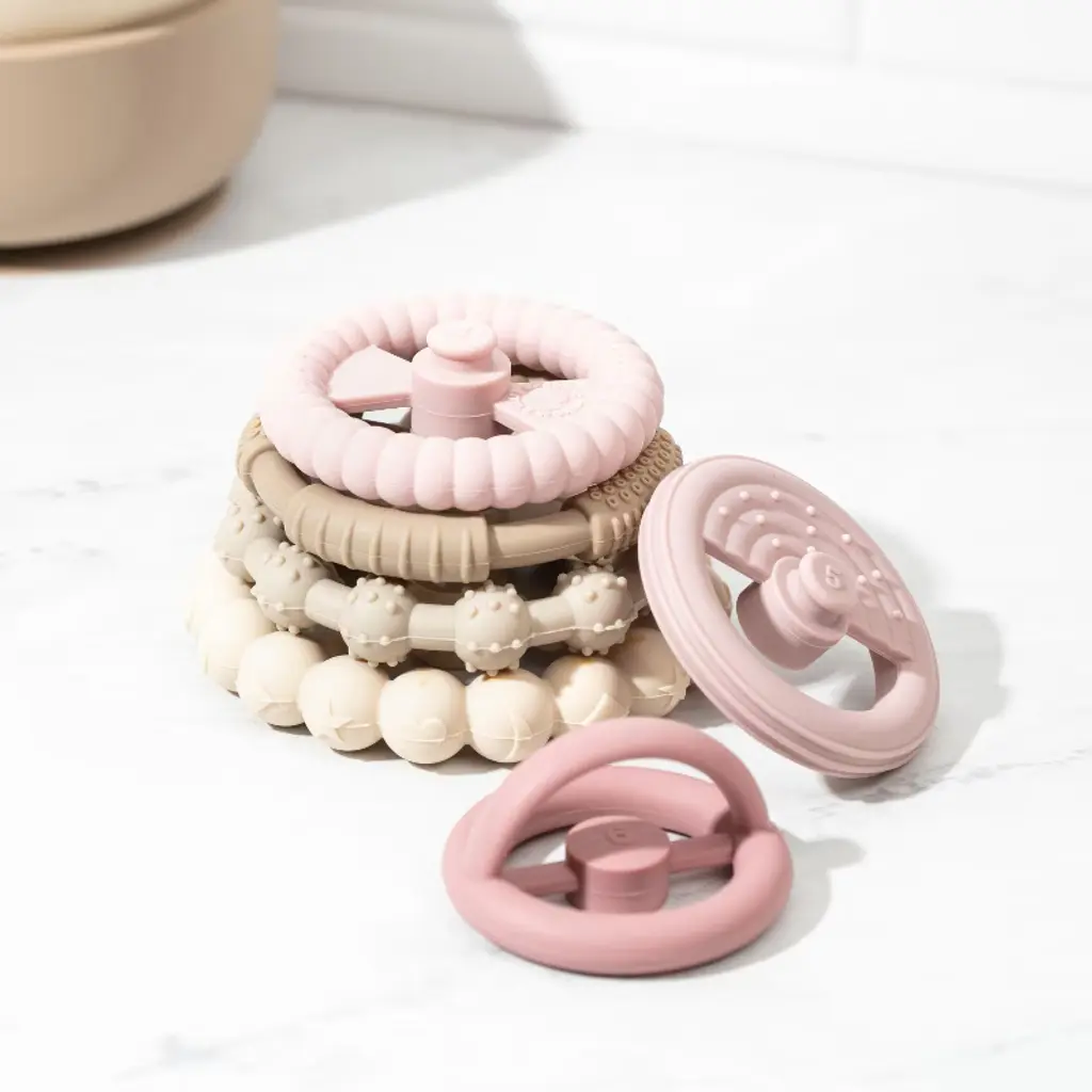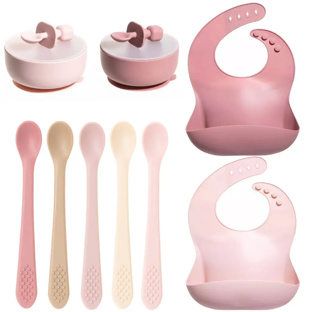 Silicone Baby Essentials Set – Pink Stacking Toy, Feeding Bibs, Suction Bowls With Spoons & First-stage Spoons – Bpa-free, Safe For Infants & Toddlers