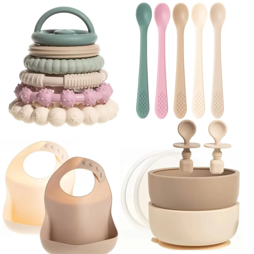 Elevate your baby’s mealtime experience with this all-in-one feeding set, available in charming pink, calming blue, or neutral tan. Thoughtfully designed for growing babies and toddlers, this set combines style, safety, and practicality to support every stage of feeding. Each set includes a soft silicone bib with a wide food-catching pocket, ergonomic silicone spoons for gentle feeding, and spill-proof suction bowls that stay in place. The set also features soothing silicone teething toys, perfect for comforting your little one during teething. Crafted from 100% food-grade silicone, this set is BPA-free and safe for microwave use, making meal prep quick and easy. Dishwasher-safe and stain-resistant, it ensures hassle-free cleanup. Perfect for parents or as a gift, this feeding set blends functionality with modern design for a delightful mealtime journey.