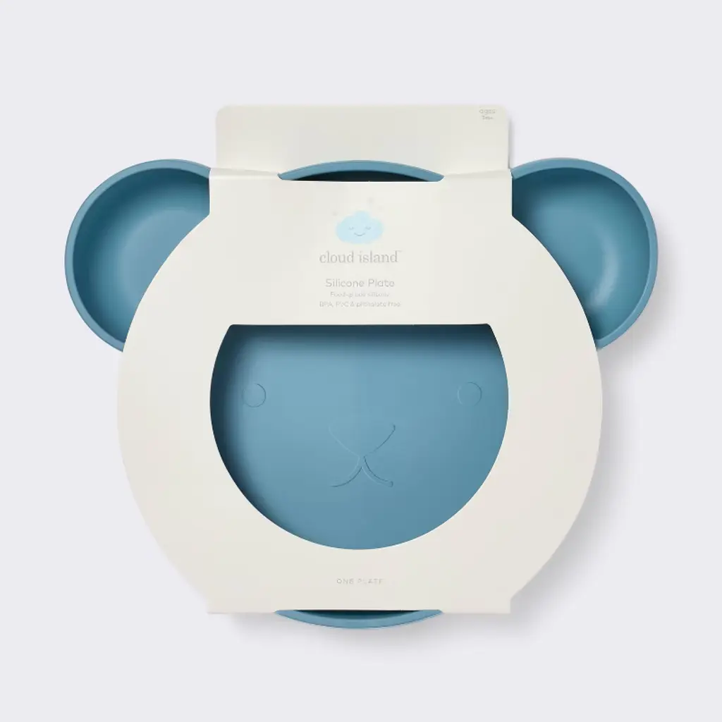Bring a fun and adorable touch to your baby's mealtimes with this Silicone Dining Plate from cloud island™. Designed in a cute bear face shape with ears, this silicone dining plate features one large and two small sections for serving different foods to them. Made from food-grade silicone and free from PVC, BPA and phthalates, it features raised sides that help prevent food from falling and allow for easy scooping. Microwave safe for reheating food, you can toss it in the dishwasher for easy cleanup.cloud island™: Designed with love. Made without compromise.