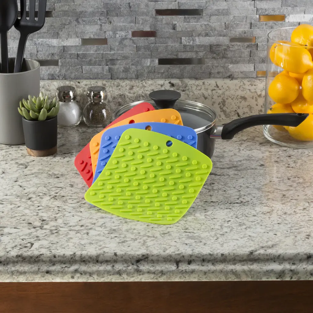 The Windsor Home set of 4 pc Silicone Pot Holders are multi-functional; can be used as Pot Holders, Trivet Mat, Jar Opener, Spoon Rest, or Garlic Peeler. Durable and practical to use. Four fun colors, Blue, Red, Green, and Orange. Easy storage as can be rolled up, or can hang from a hook. MULTI-FUNCTIONAL - Our durable pot holders are the ideal kitchen accessory! These practical silicone holders can be used as a pot holder, trivet mat, jar opener, spoon rest, or even a garlic peeler. Holders are heat resistant and can help protect your table from hot items, or can be used to pick up or move a hot dish. Works great as a jar opener and garlic peeler by simply wrapping the holders around the jar or garlic clove and just twisting. The rigged side gives you the grip you need on slippery items.EASY STORAGE - Set includes 4 Silicone Pot Holders in fun colors that can be rolled and stored, or can be hung using a hook.DURABLE AND FLEXIBLE - The flexible material allows for ease of use and more comfort in handling a hot dish or pot, adding safety. Fashionable to use in the kitchen, and practical and safe to use for grilling outdoors. Perfect for indoor or outdoor usage.PRODUCT SPECIFICATIONS - Four Multi-Color Pot Holders - Blue, Red, Orange, and Green. Flexible, Non-Stick Silicone. Can be hung on hooks. Dimensions: 7 inches (Length) x 6.75 inches (Width)