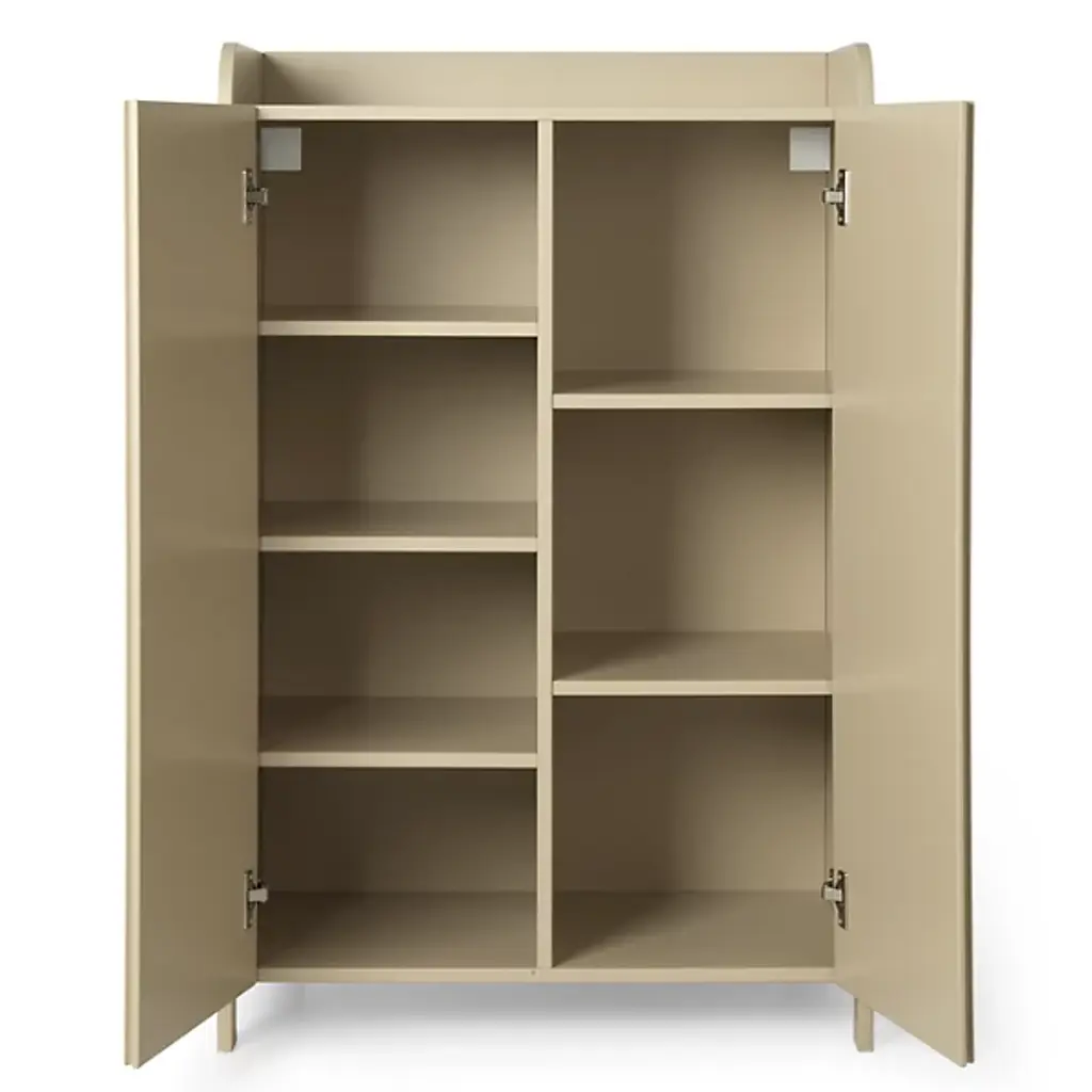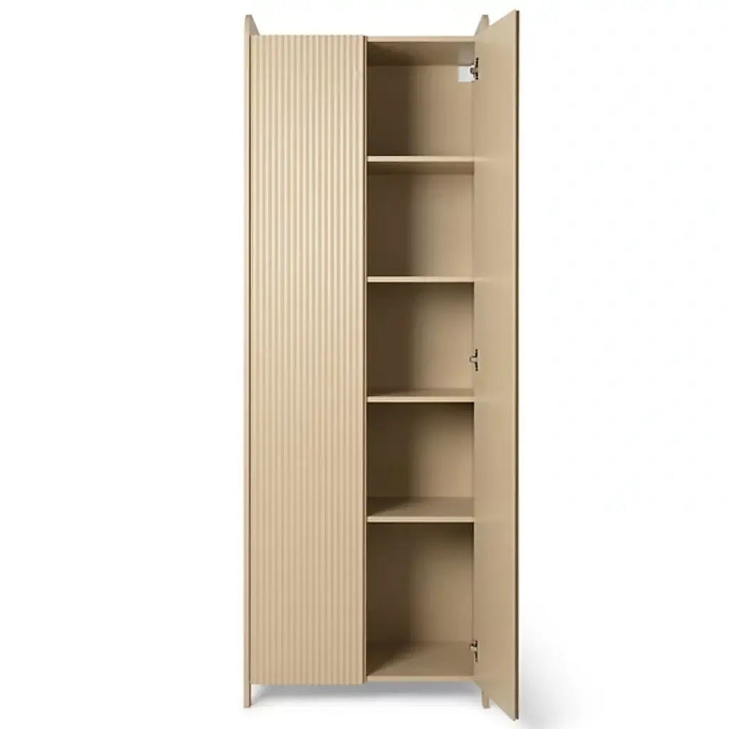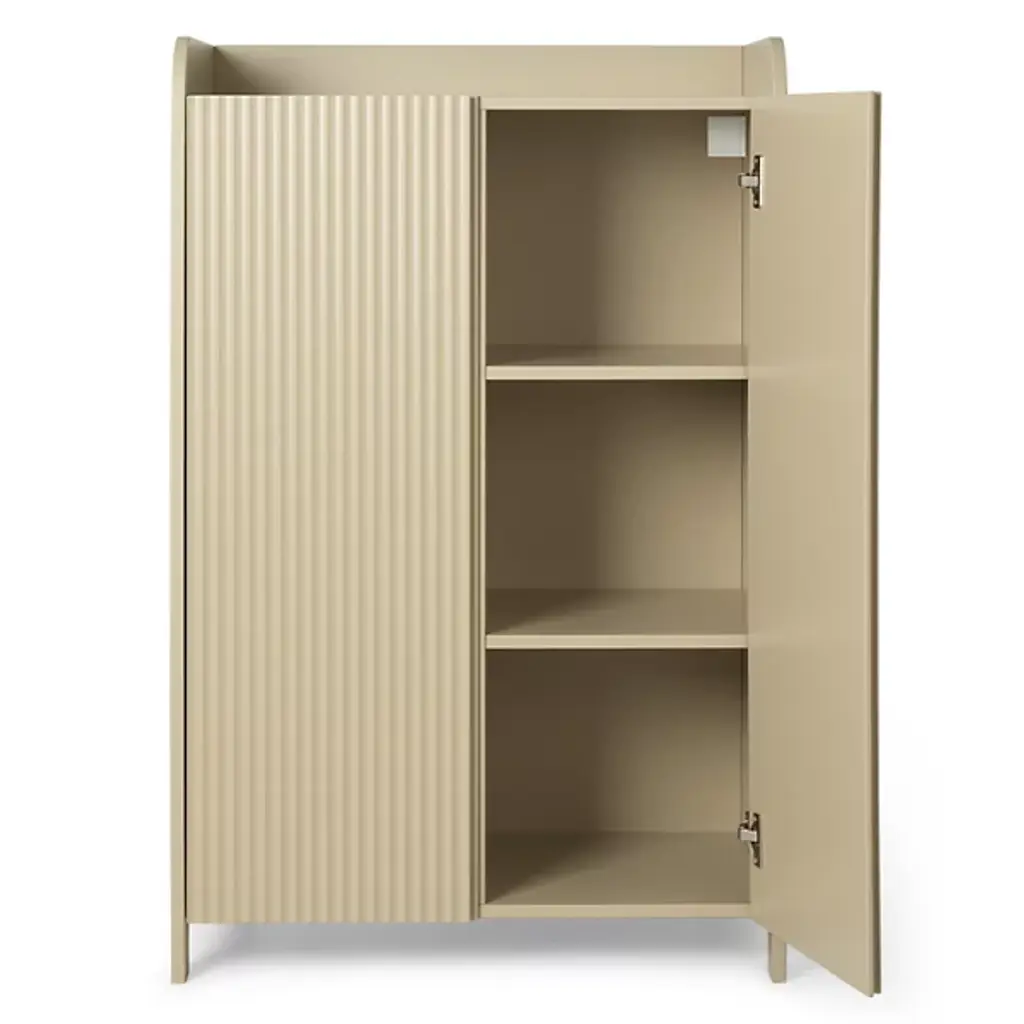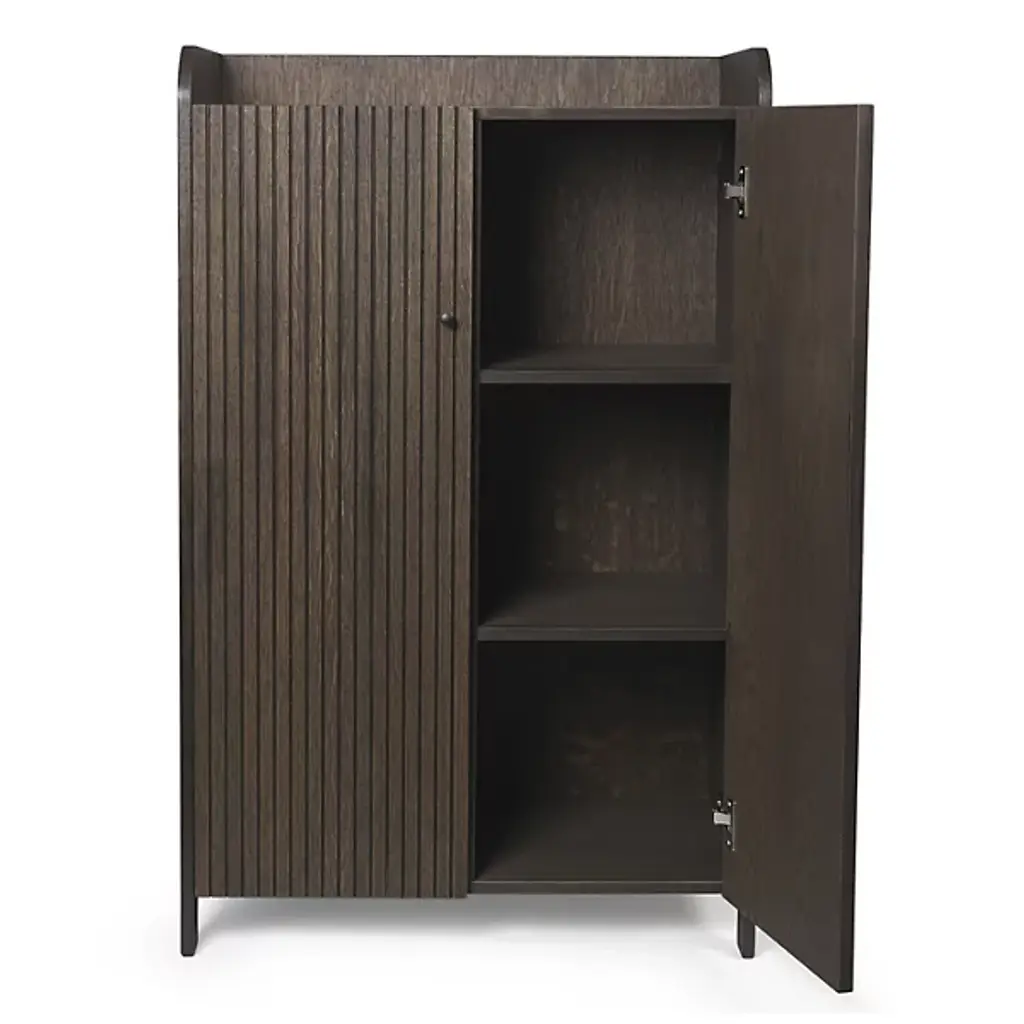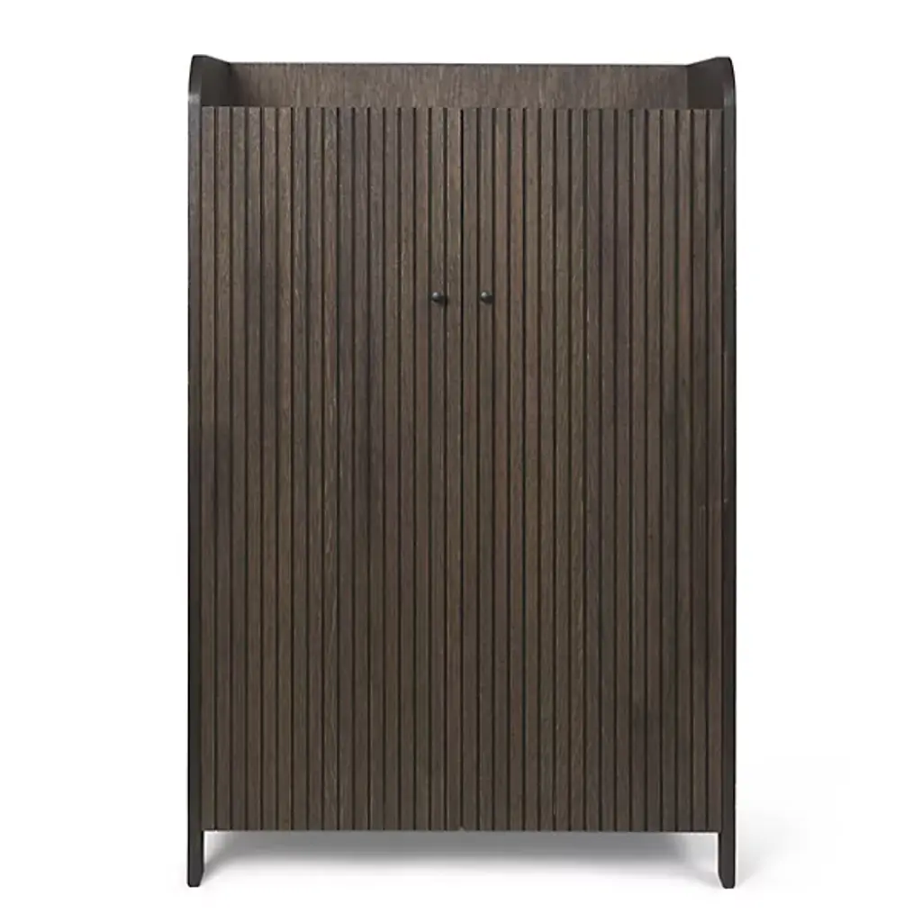 The Sill Cupboard from Ferm Living takes its name from the French word sillon, referencing the carved grooves that pattern its doors in vertical lines. These shallow channels create a tactile surface that transforms flat panels into something more dimensional, adding rhythm through the repetition of narrow ridges. The top surface features raised edges on three sides, creating a usable ledge for display or storage. Constructed from FSC Mix certified oak veneer over an MDF core, the piece offers enclosed storage behind its grooved doors, while the lip above keeps smaller items from sliding off.