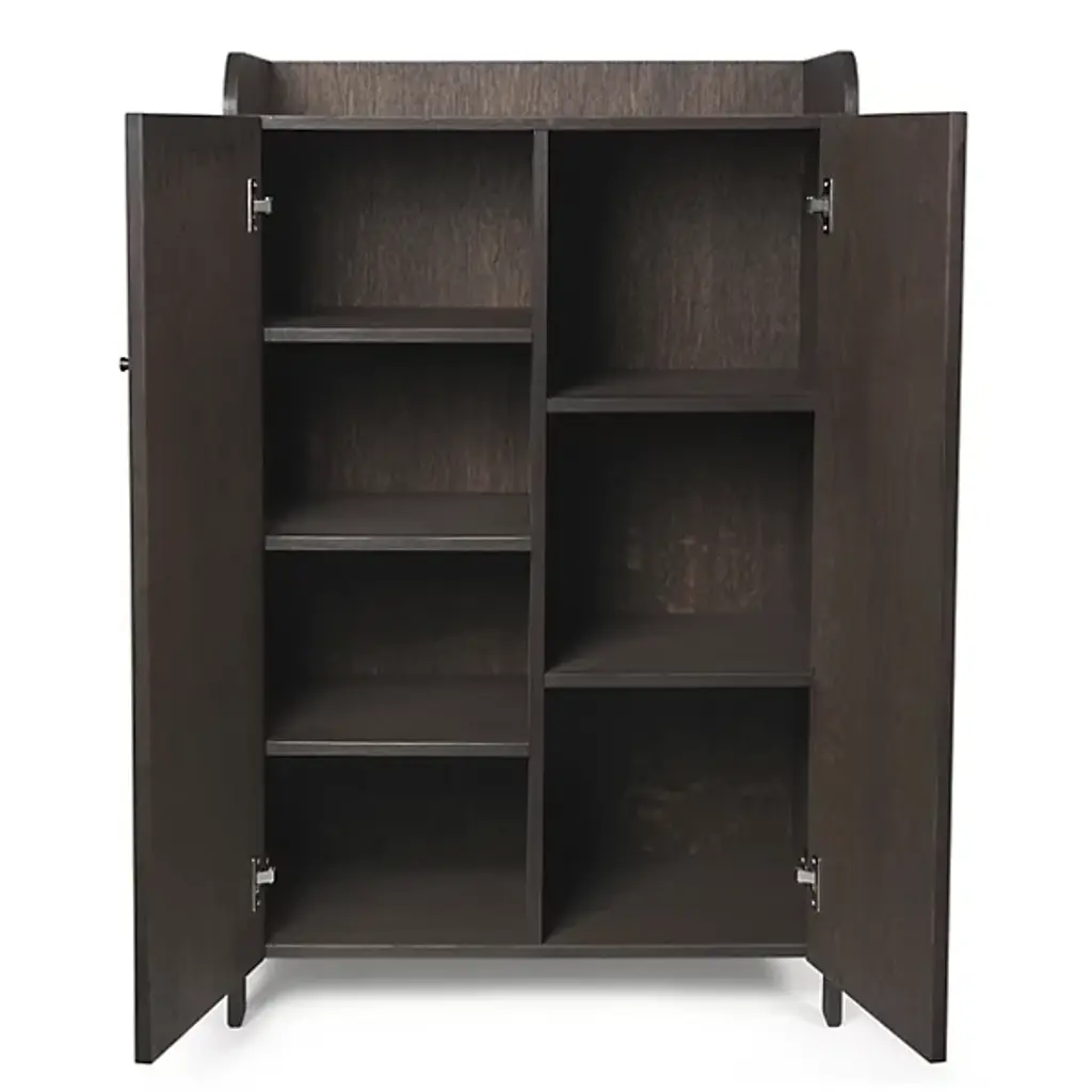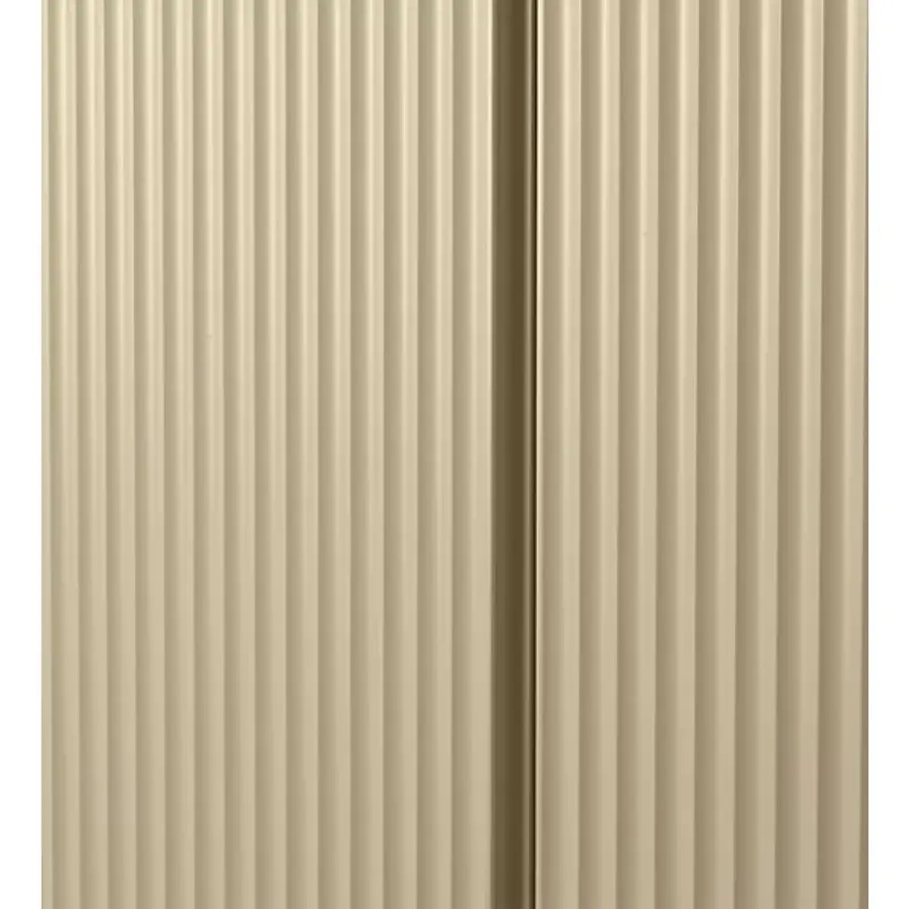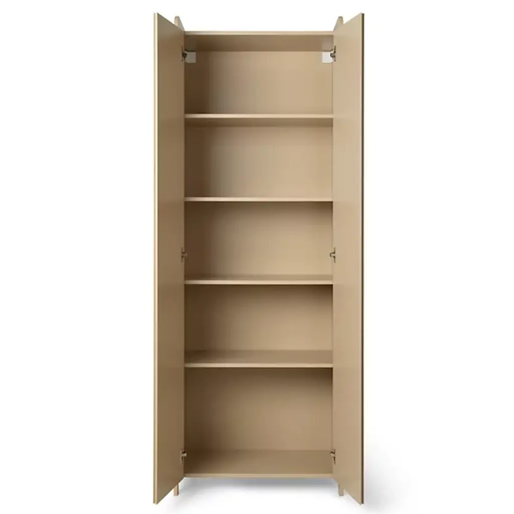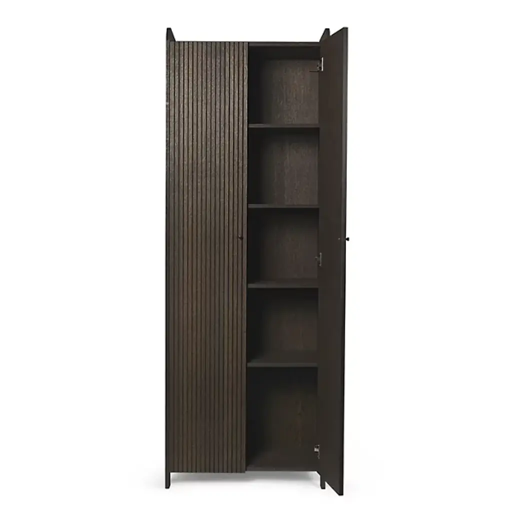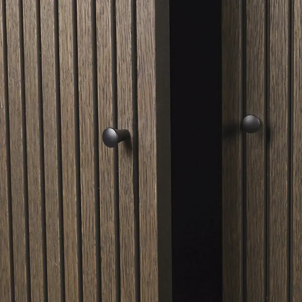 The Sill Cupboard from Ferm Living takes its name from the French word sillon, referencing the carved grooves that pattern its doors in vertical lines. These shallow channels create a tactile surface that transforms flat panels into something more dimensional, adding rhythm through the repetition of narrow ridges. The top surface features raised edges on three sides, creating a usable ledge for display or storage. Constructed from FSC Mix certified oak veneer over an MDF core, the piece offers enclosed storage behind its grooved doors, while the lip above keeps smaller items from sliding off.