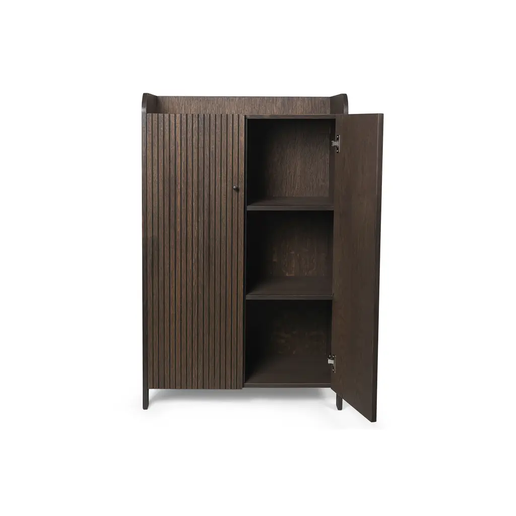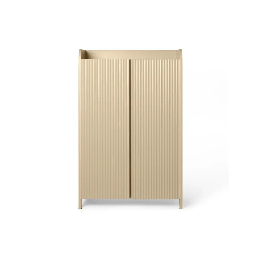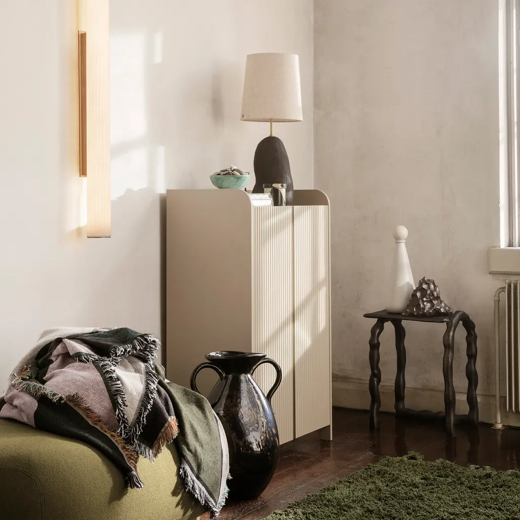 A small cupboard with a spacious interior, Sill from Ferm Living is practical, versatile and modern. The design takes inspiration from the technique of carving grooves in the surface of wood. Consequently, this cupboard features a vertical ridge pattern that adds a gorgeous texture to any décor. Apart from its good looks, Sill delights with a conveniently compact shape and roomy interior. The shelves divide the small cupboard into two sections with four and three storage spaces. On top, raised edges on three sides create an extra space for the storage and display of items. Perfect for any room, the Ferm Living Sill Cupboard suits a variety of uses, from holding plates and glassware in the kitchen to sheets and blankets in the bedroom or toys and clothing in a child’s room. This small cupboard is made from FSC Mix-certified oak veneer with an MDF core and comes with safety brackets.