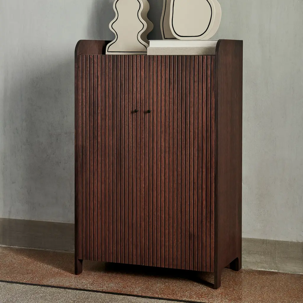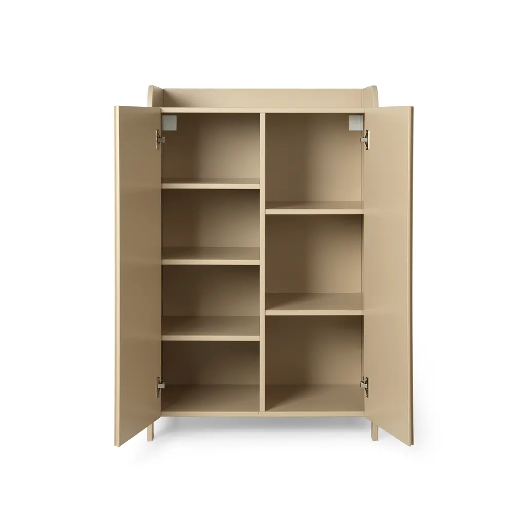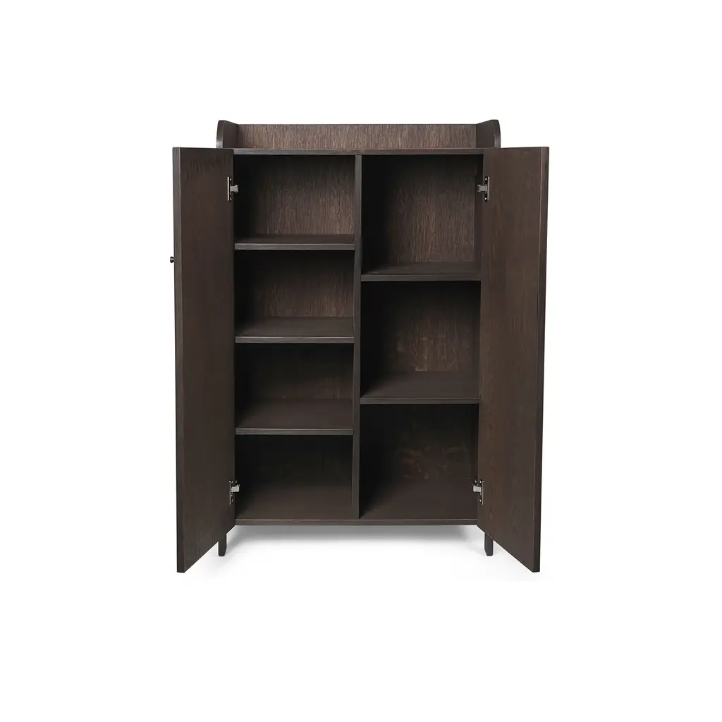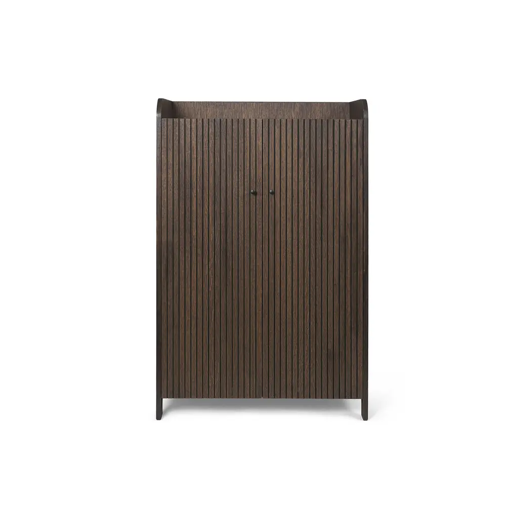 A small cupboard with a spacious interior, Sill from Ferm Living is practical, versatile and modern. The design takes inspiration from the technique of carving grooves in the surface of wood. Consequently, this cupboard features a vertical ridge pattern that adds a gorgeous texture to any décor. Apart from its good looks, Sill delights with a conveniently compact shape and roomy interior. The shelves divide the small cupboard into two sections with four and three storage spaces. On top, raised edges on three sides create an extra space for the storage and display of items. Perfect for any room, the Ferm Living Sill Cupboard suits a variety of uses, from holding plates and glassware in the kitchen to sheets and blankets in the bedroom or toys and clothing in a child’s room. This small cupboard is made from FSC Mix-certified oak veneer with an MDF core and comes with safety brackets.