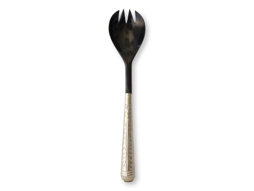 Vintage salad servers featuring faux tortoise shell blades and elegant sterling silver-wrapped handles. Though unmarked, the handles have been tested and confirmed as silver, ensuring their quality. These servers combine classic style with a touch of luxury, making them a sophisticated addition to any dining set or collection. Perfect for those who appreciate timeless design and understated elegance in their tableware.
