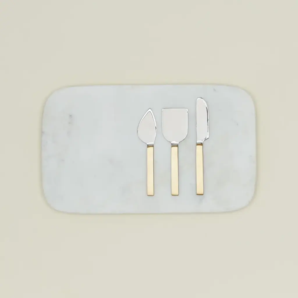Elevated essentials. This cheese knife set blends pared-back shapes with sleek materials for a refined yet unfussy addition to your serveware collection. Crafted from durable stainless steel with warm brass-toned handles, it brings a hint of shine to wine nights and dinner parties alike. Set of three.
