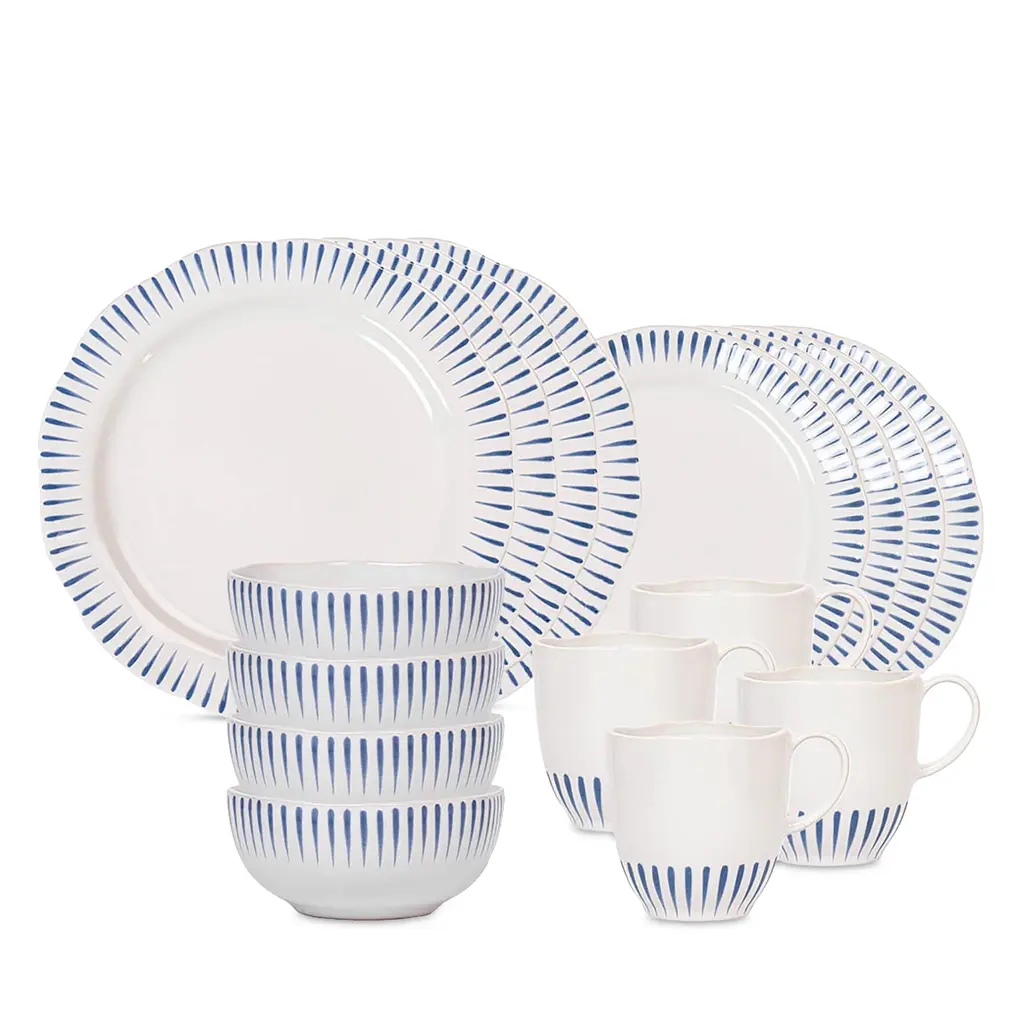 Inspired by the idyllic town of Sitio, Portugal, comes a fresh and relaxed pattern that puts an artistic exclamation point on everything within its frame of radiating stripes. This 16 piece set provides service for four and includes four of each: dinner plates, dessert/salad plates, cereal/ice cream bowls and mugs.