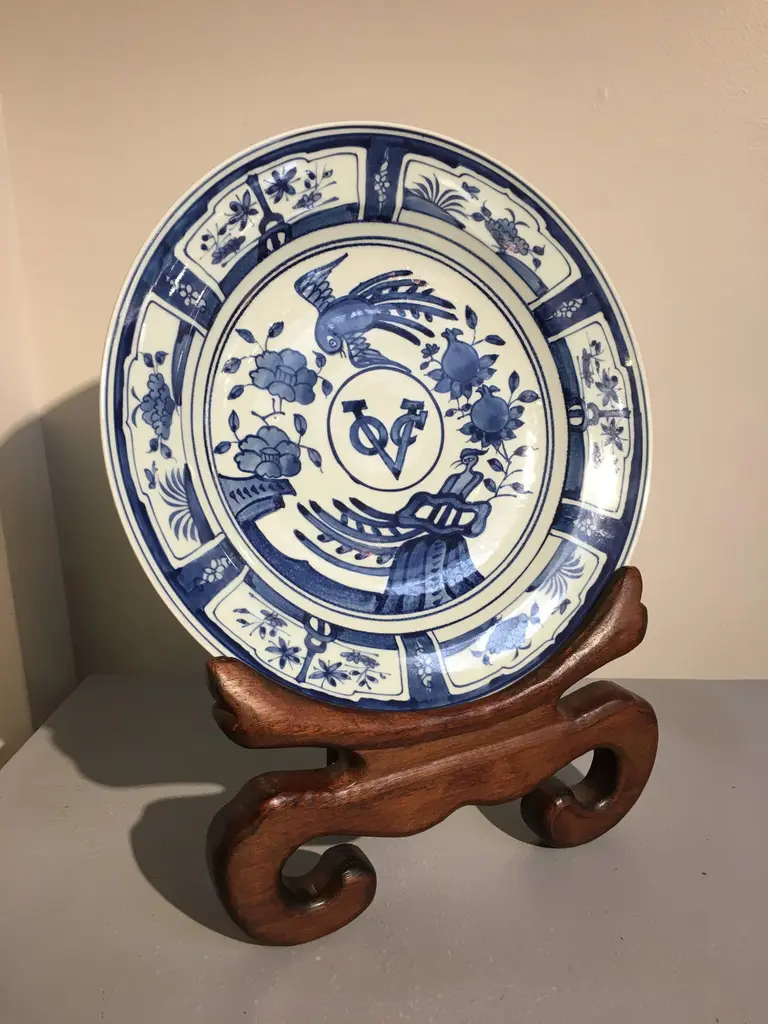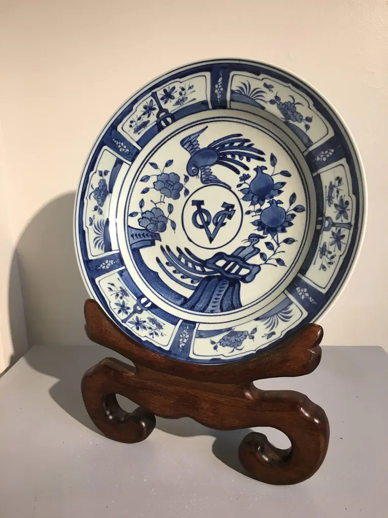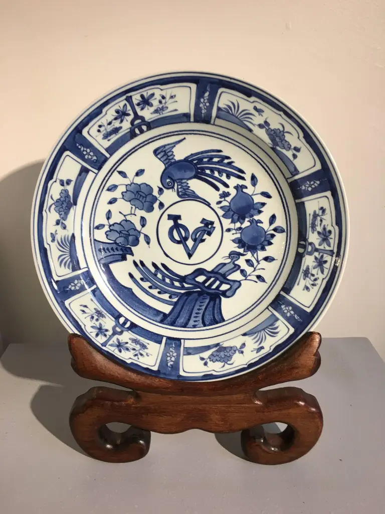 Six Japanese export style blue and white porcelain chargers, 20th century, China or Japan.The blue and white porcelain chargers decorated in the kraak style, and emblazoned with the VOC logo for the Dutch East India Trade Company (Vereenigde Oost-Indische Compagnie).The brilliant blue and white porcelain painted with a traditional pattern of long tailed birds and flowers, with the addition of a pair of pomegranates. The backs undecorated. Based on the original Japanese Arita ware designs of the 17th and 18th centuries. Provenance:Christie'sThe Palladian Villa by Michael Smith.