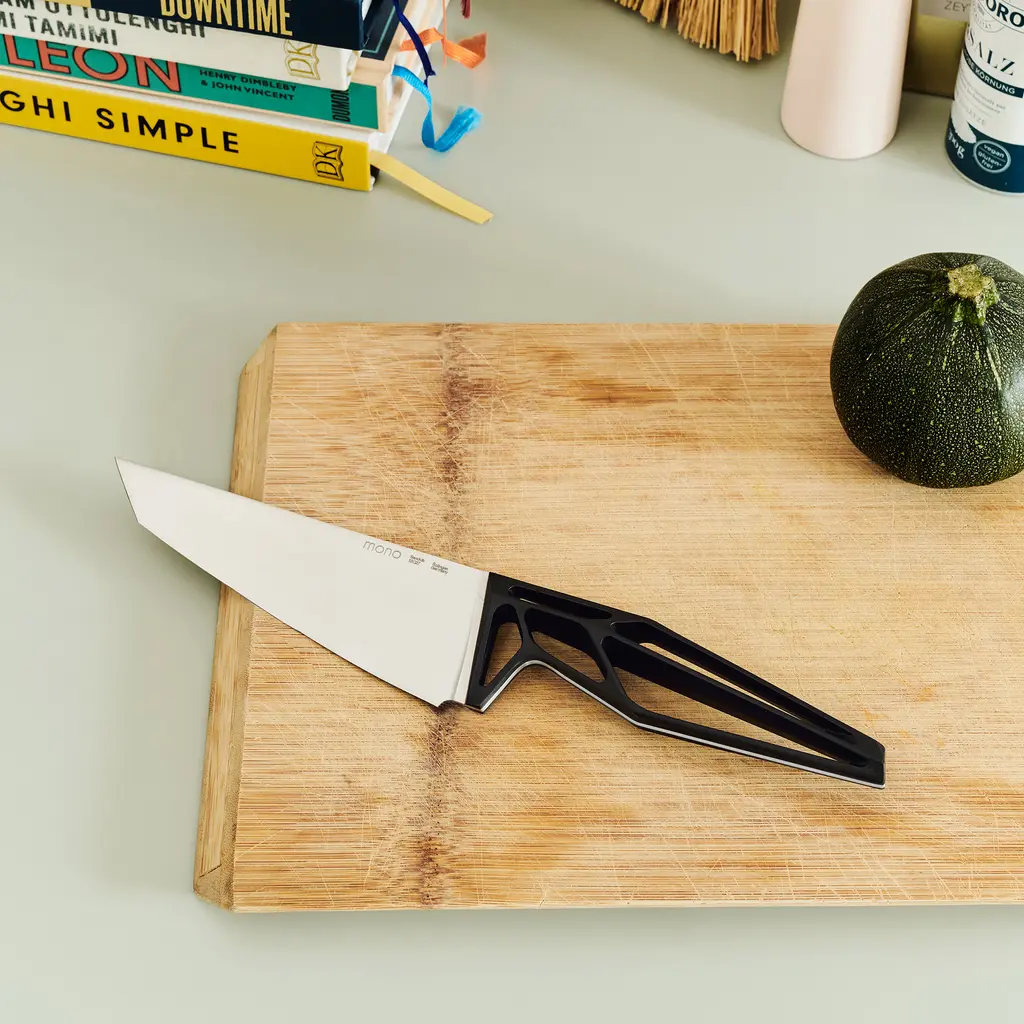 High-end design meets state-of-the-art steel crafting techniques in the Mono SK59 series. Made with a high-performance Sandvik 12C27™ steel blade hardened to 59 Rockwell, the Mono SK 59 Chef’s Knife is ultra-sharp, durable, flexible, non-porous, and corrosion-resistant. The blade measures 17cm in length and it’s perfect for most slicing and cutting jobs in the kitchen. The futuristic style handle has an angular form and an ergonomic shape, making holding the knife as comfortable as possible. High-quality and long-lasting, the knife comes with a polyamide-reinforced fiberglass handle and a steel blade that will stay sharp for longer. Made in Germany. Other knives from the same collection are also available.