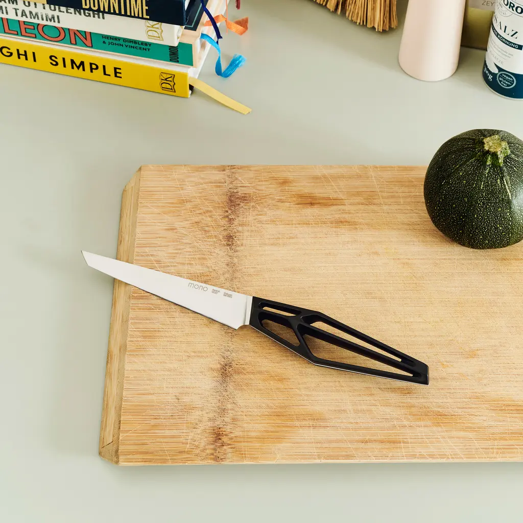 Part of the Mono SK59 collection, this utility knife offers the perfect blend of high-end design and superior performance. Designed by Gido Wahrmann, the series features futuristic handles with an angular design and an ergonomic silhouette. Crafted from fiberglass, the lightweight handles have a polyamide-reinforced build for more durability. The Mono SK59 Utility Knife comes with a high-performance Sandvik 12C27™ steel blade that has been hardened to 59 Rockwell. Sharpened and smoothed to perfection, the blade is durable, flexible, non-porous, and corrosion-resistant. This knife’s blade measures 14cm in length. The design makes it suitable for a wide range of fruit and vegetables. Complement this utility knife with the chef’s knife and the ham knife from the same collection.