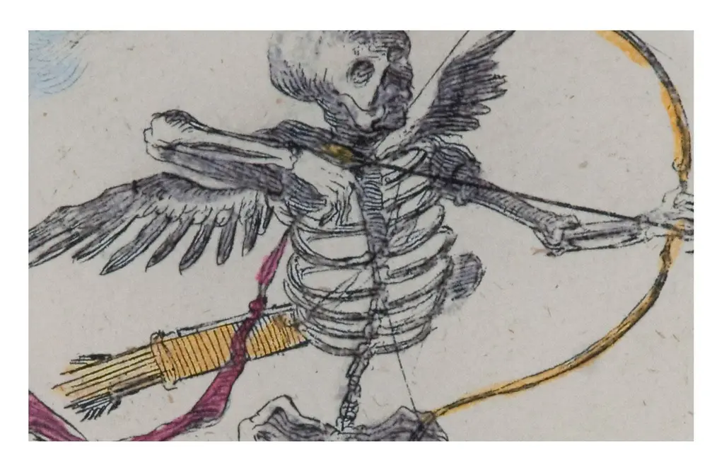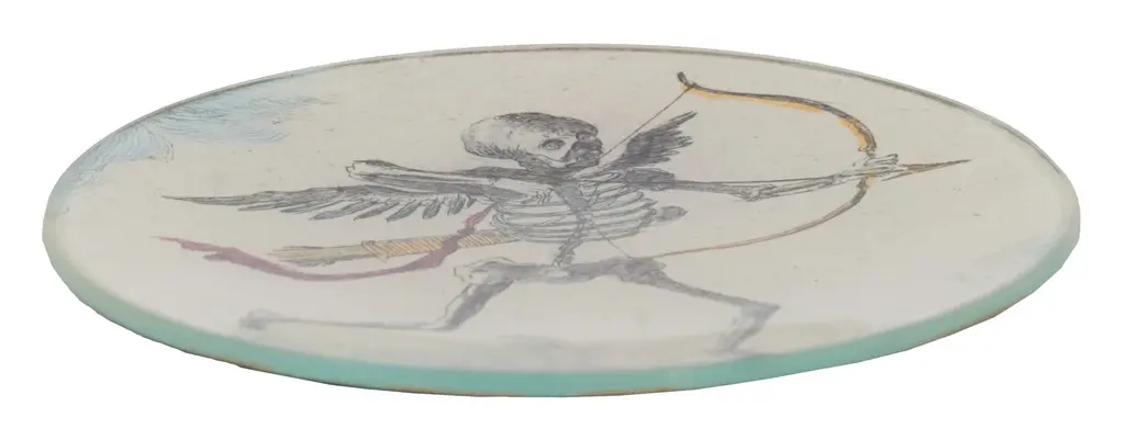 A macabre take on the Cupid mythology, the Skeleton With Arrow Plate is the perfect combination of eerie and charming. It features a vintage illustration of a winged skeletal archer, taken from celebrated designer John Derian's expansive collection of antique images. This curious picture has been recreated under handblown glass to create a decoupaged plate that makes a perfect catch-all on the nightstand or a worthy addition to a gallery wall. The Skeleton With Arrow Plate could also make a unique Valentine's gift for the one you love, till death do you part. •handmade decoupage •vintage image •handblown glass •john derian Dimensions •5.75" diameter