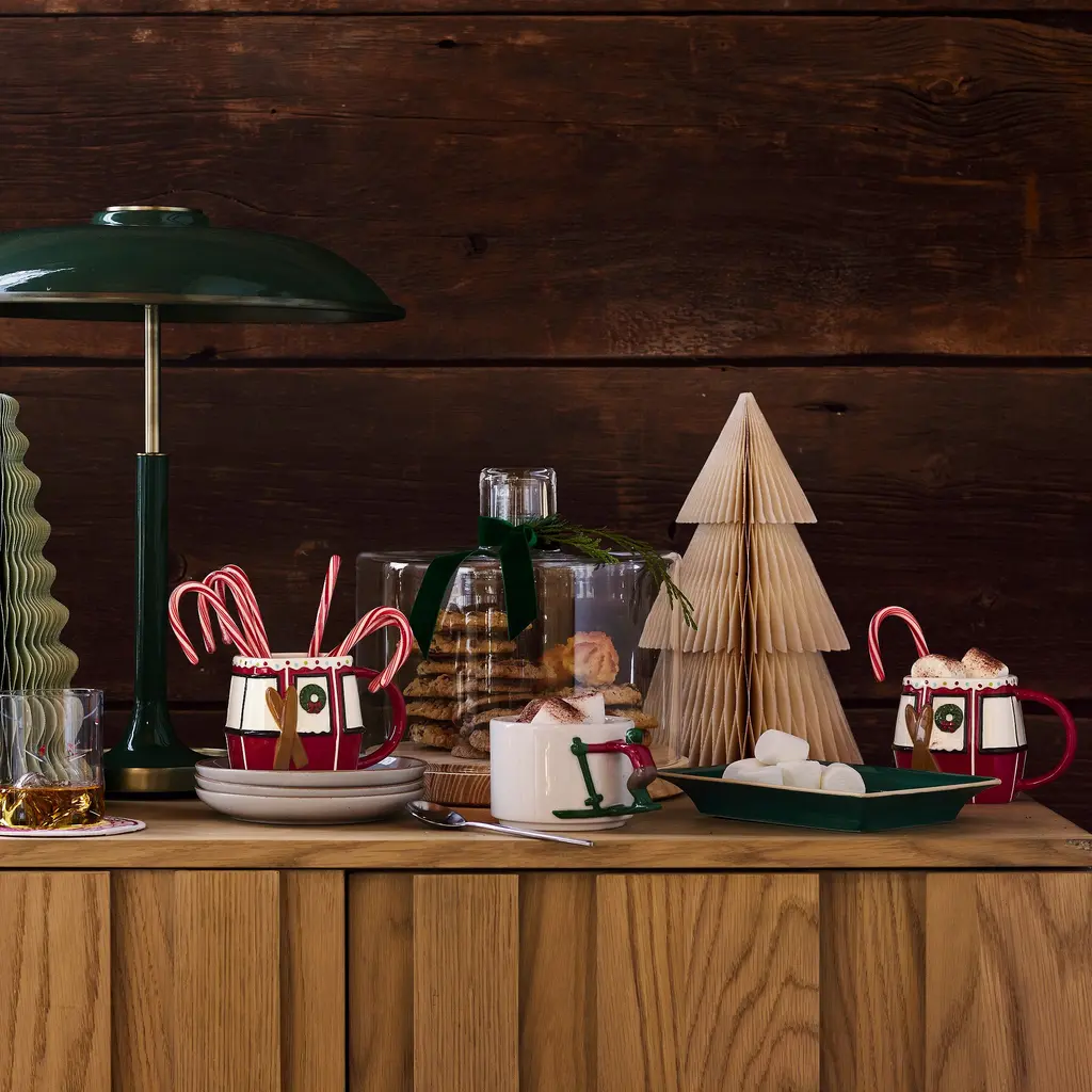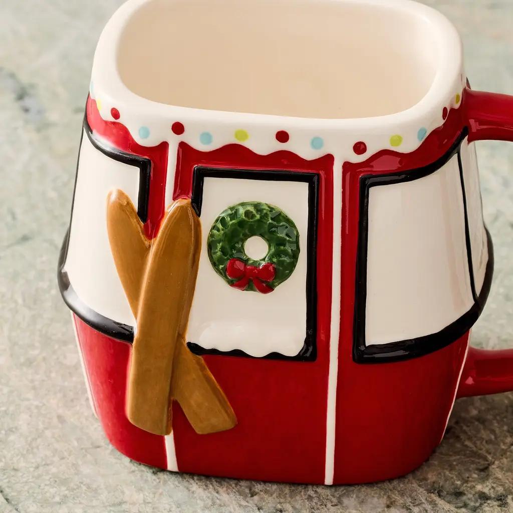 Mimics the adorable look of a gondola. Enjoy hot cocoa, coffee and more in seasonal style. Made of durable stoneware for everyday use. It's microwave and dishwasher safe.