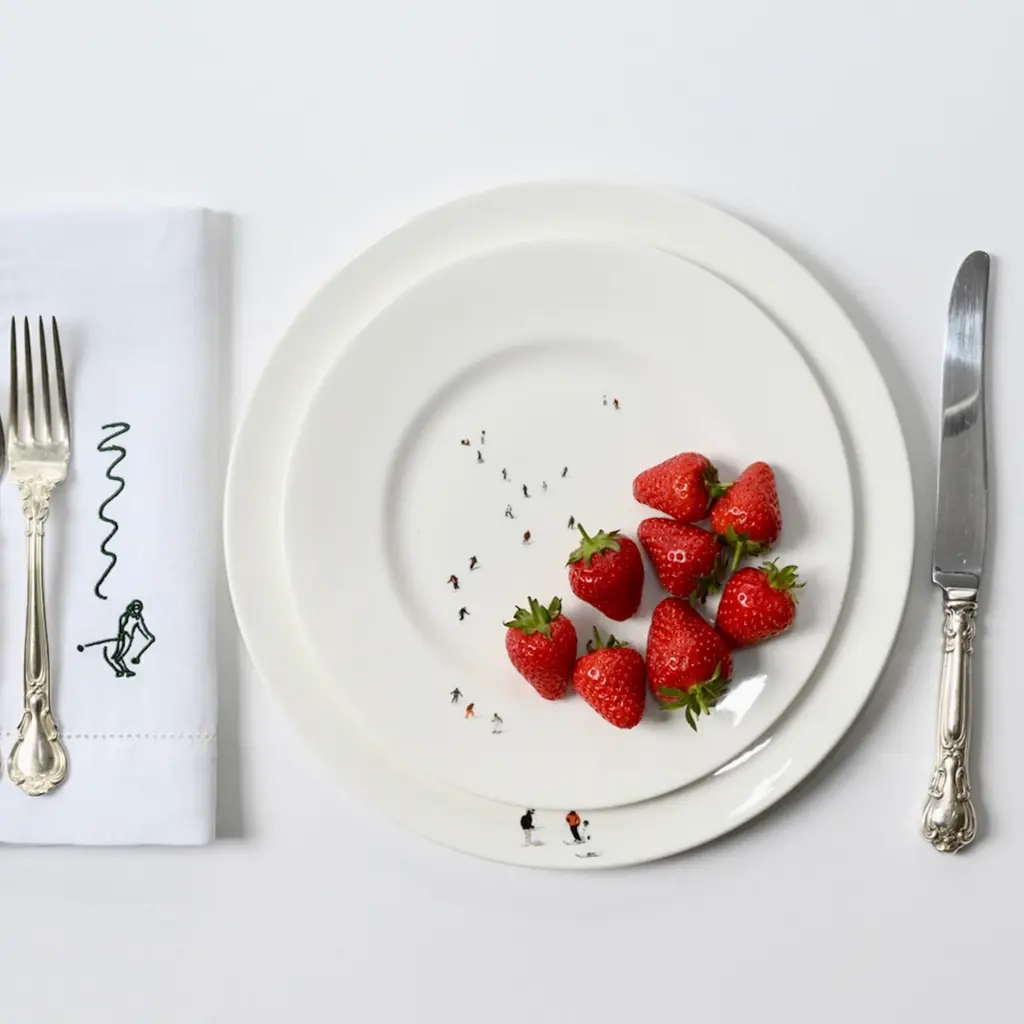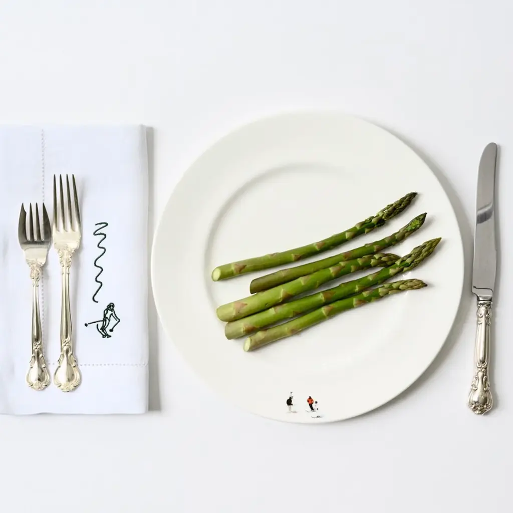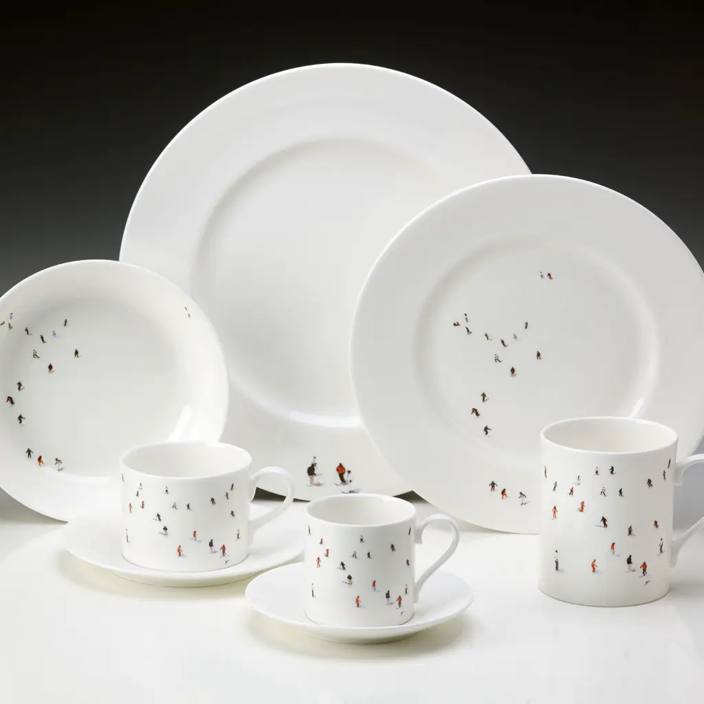 Skiers Plate from the Skiers China range by Dede Johnston- imagery taken from her 2008 photograph 'Crowded Slopes'. Skiers China is manufactured in fine bone china in Staffordshire, England. Dishwasher and microwave safe.