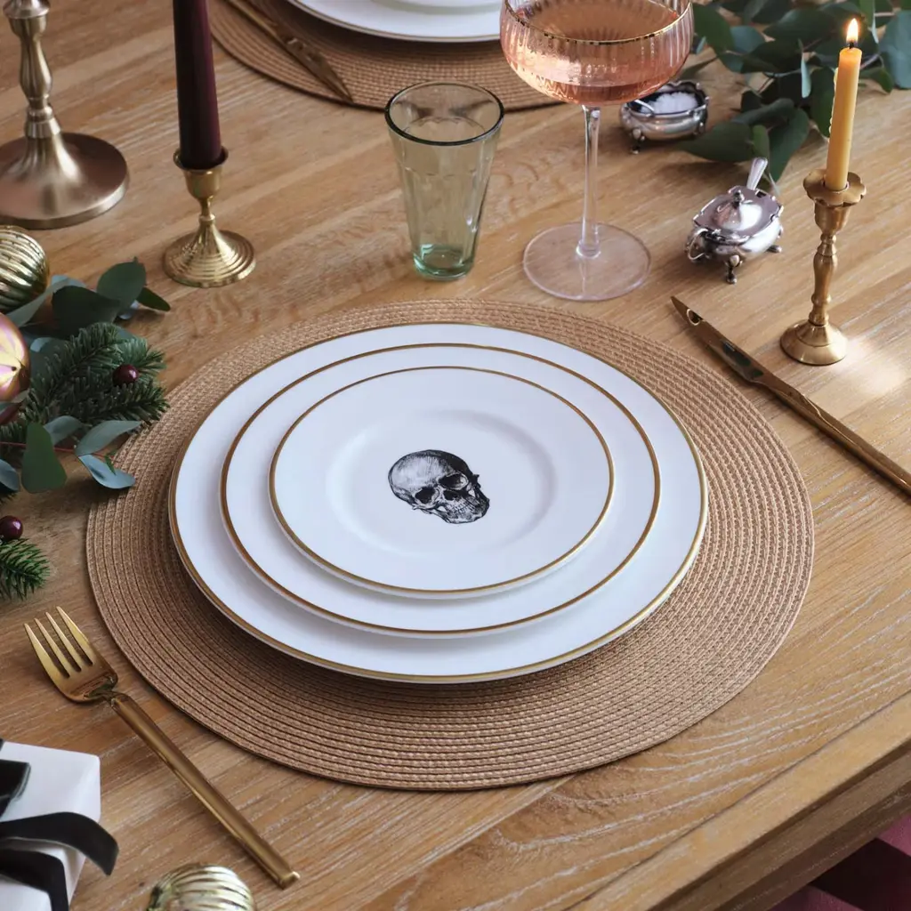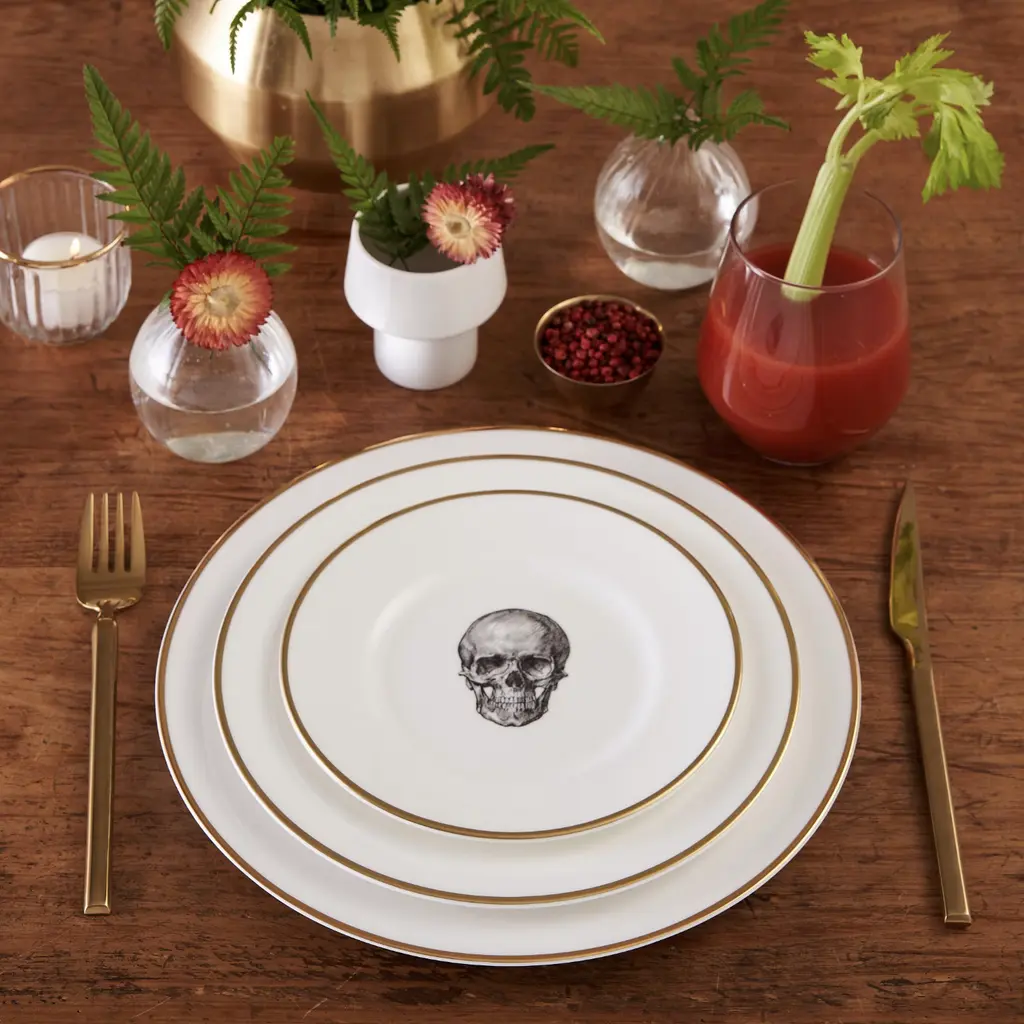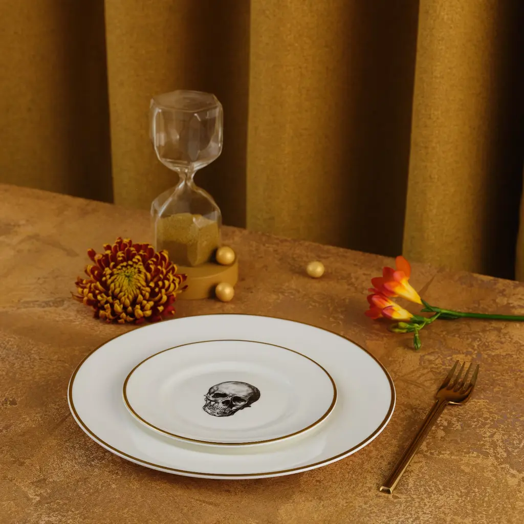 An exquisitely handcrafted fine bone china dessert/side plate with the Skull design from the Melody Rose Rock and Roll collection. Features with hand painted 22kt burnished gold gilded trim, both beautiful to display but entirely functional and can be used everyday. Perfect on it’s own or mix, match and layer with plates in different sizes and bowls from any of the Melody Rose collection to create a heritage tableware set with a 21st century twist.