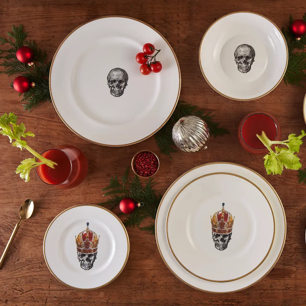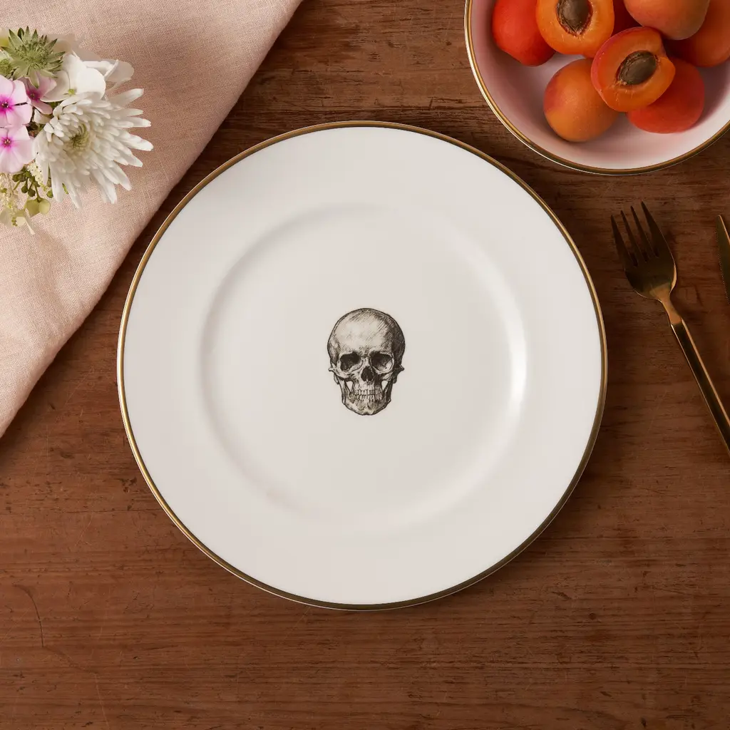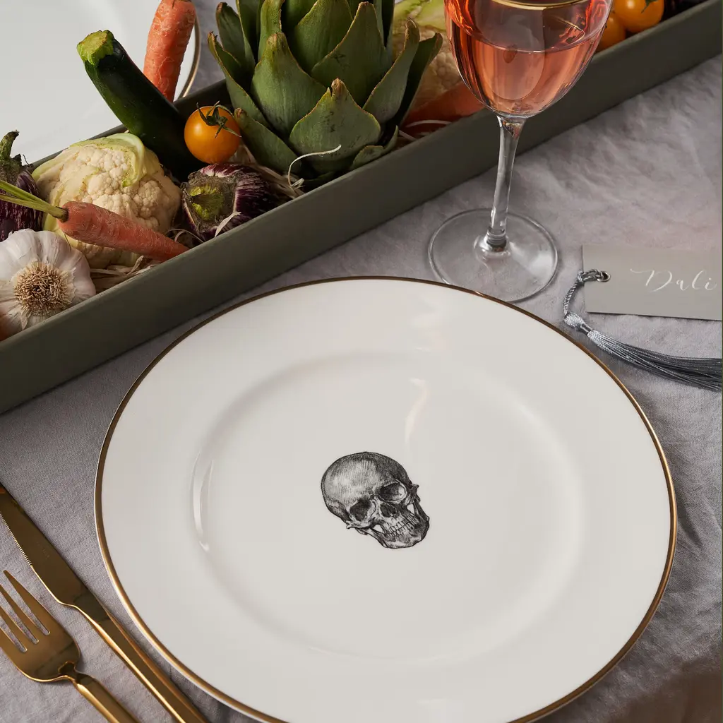 Exquisitely handcrafted fine bone china dinner plate with the Skull design from the Melody Rose Rock and Roll collection. Each plate has been finished with a hand painted 22kt burnished gold trim for a luxurious and dishwasher friendly finish.The playful design paired with the best of British craftsmanship make Melody Rose fine bone china the perfect plates for design lovers, foodies and everyone in between.Perfect on it’s own or mixed, matched and layered to create a unique and individual heritage tableware setting with a 21st century twist.