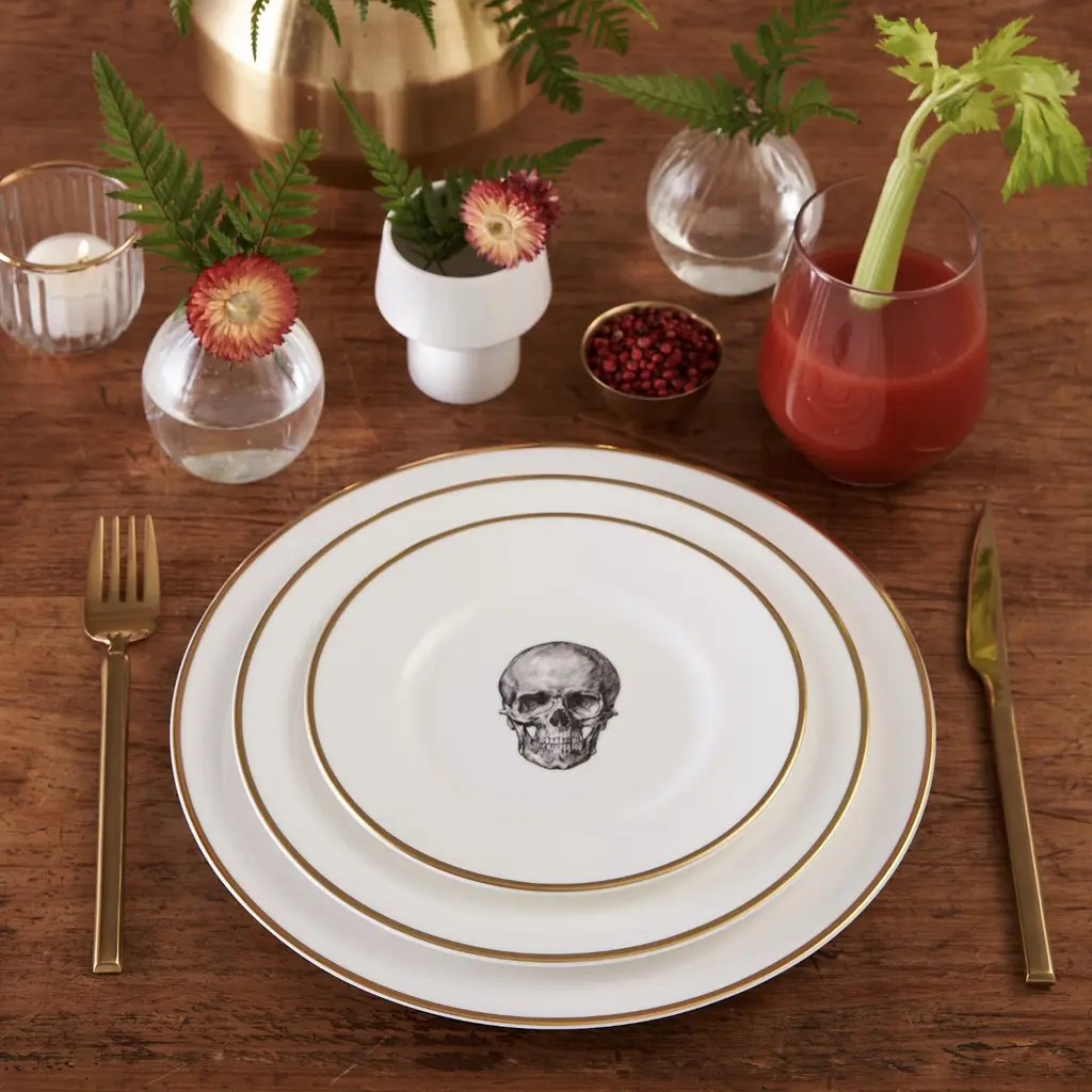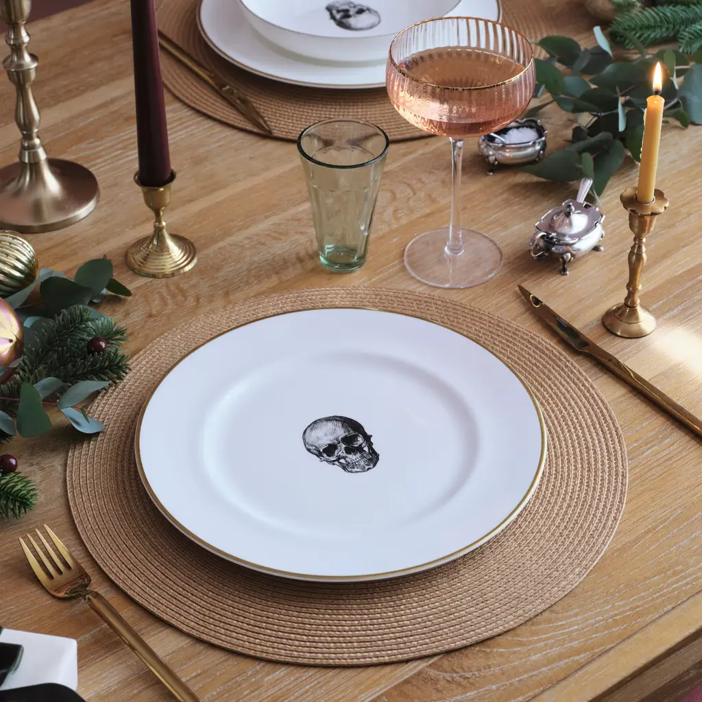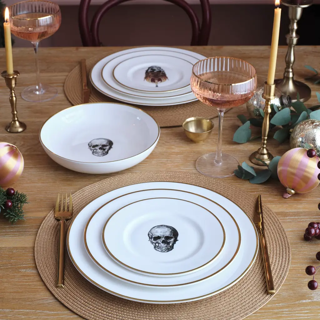 Exquisitely handcrafted fine bone china dinner plate with the Skull design from the Melody Rose Rock and Roll collection. Each plate has been finished with a hand painted 22kt burnished gold trim for a luxurious and dishwasher friendly finish.The playful design paired with the best of British craftsmanship make Melody Rose fine bone china the perfect plates for design lovers, foodies and everyone in between.Perfect on it’s own or mixed, matched and layered to create a unique and individual heritage tableware setting with a 21st century twist.