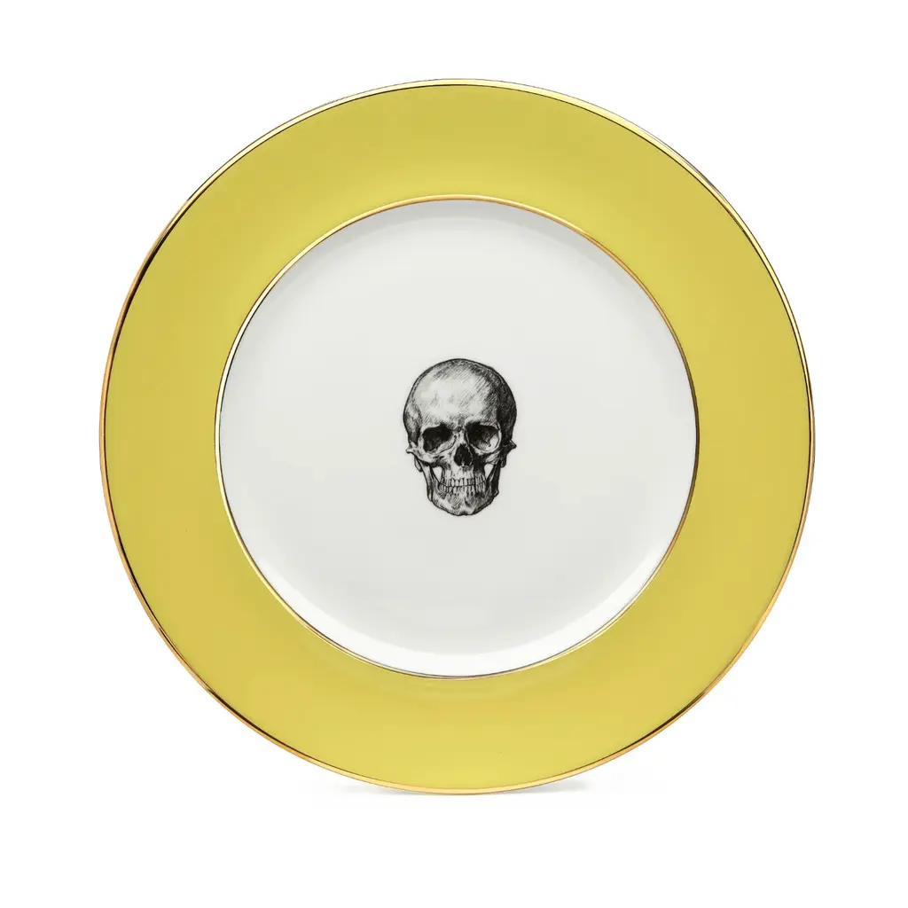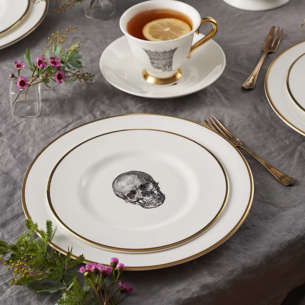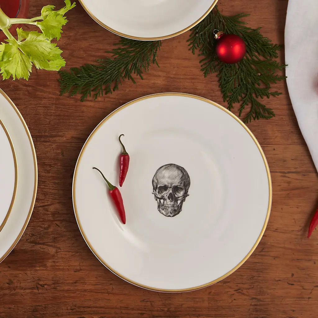 An exquisitely handcrafted fine bone china lunch/salad plate with the Skull design from the Melody Rose Rock and Roll collection. A medium size plate perfect for lunch, salad, desserts or as a smaller supper plate. Features luxurious and dishwasher friendly hand painted 22kt burnished gold edge. Skull design also available in dinner plate and smaller side/bread plate sizes, soup/cereal bowls and pasta bowls.Perfect on it’s own or mixed, matched and layered with plates and bowls from any of the Melody Rose collection to create a heritage tableware setting with a 21st century twist.