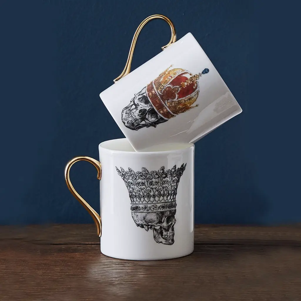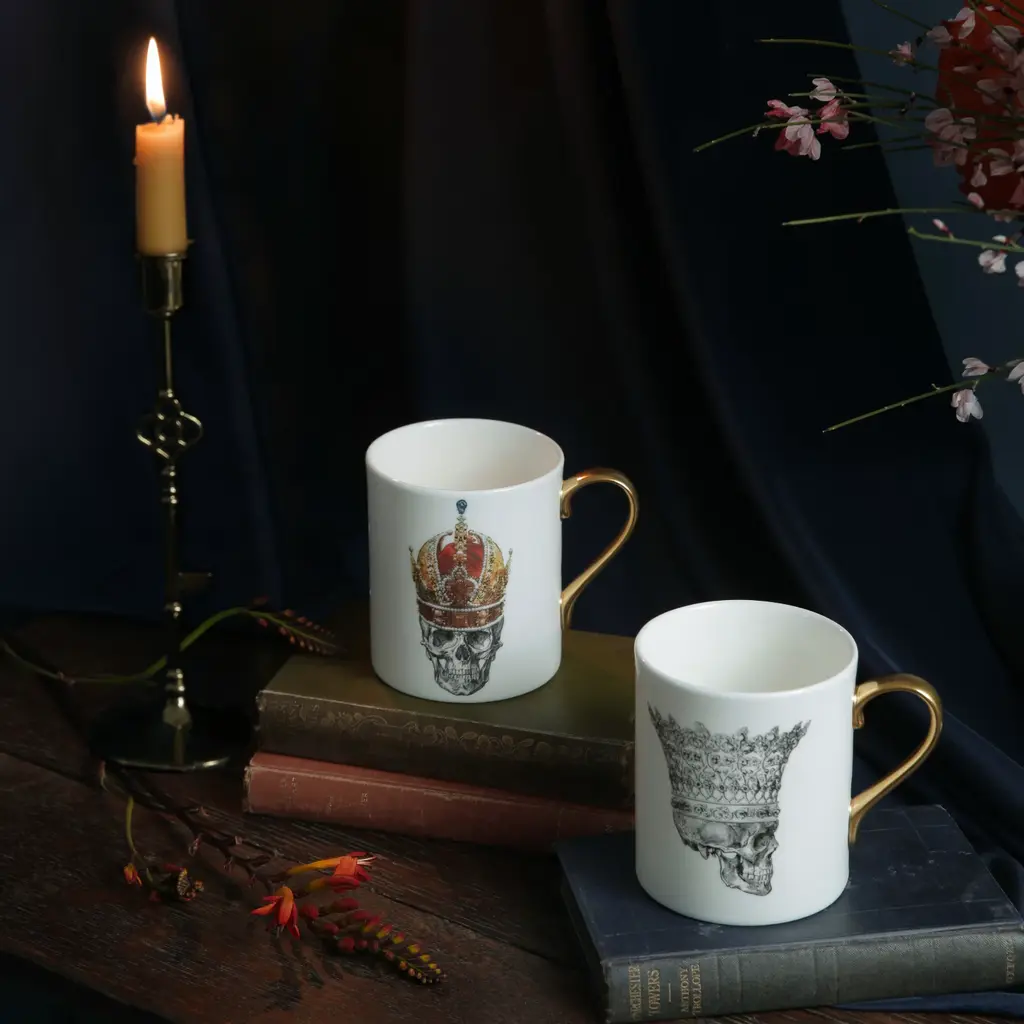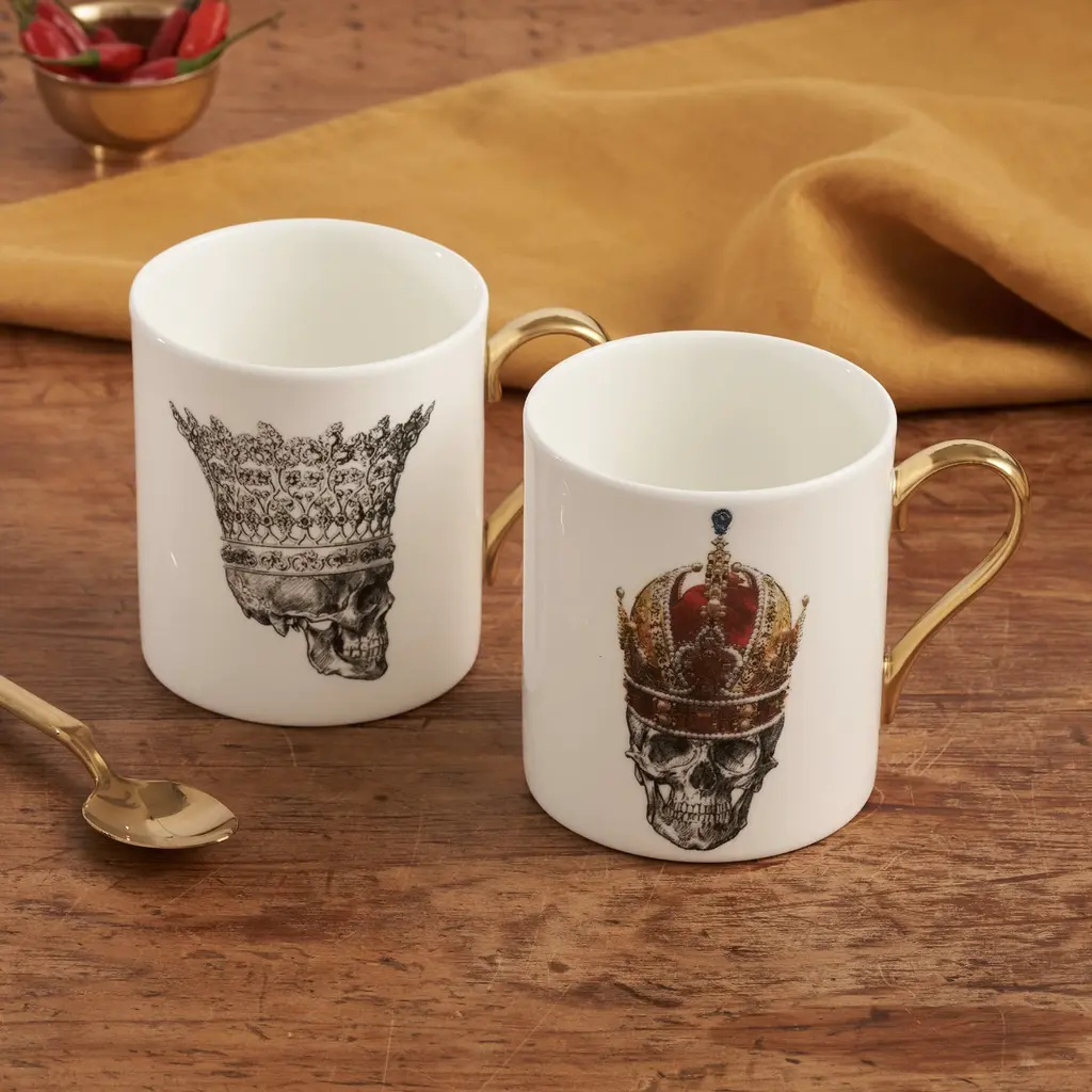 A set of two fine bone china mugs featuring a mix of our two favorite Skull in Crown designs from the Melody Rose Rock and Roll Collection.Inspired by London's edginess and cooler than cool musical heritage, the range is both playful and elegant.The exquisitely handcrafted mugs are perfect for coffee or tea on their own, or mix and match pieces from the Melody Rose fine bone china range to create a unique set.Features a hand painted 22kt burnished gold gilded handle for both a luxurious and dishwasher friendly finish.