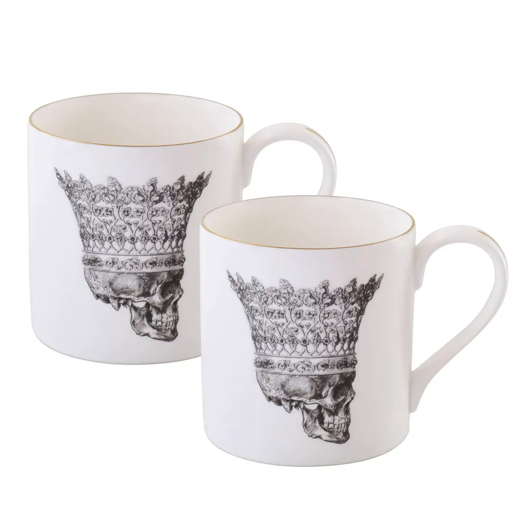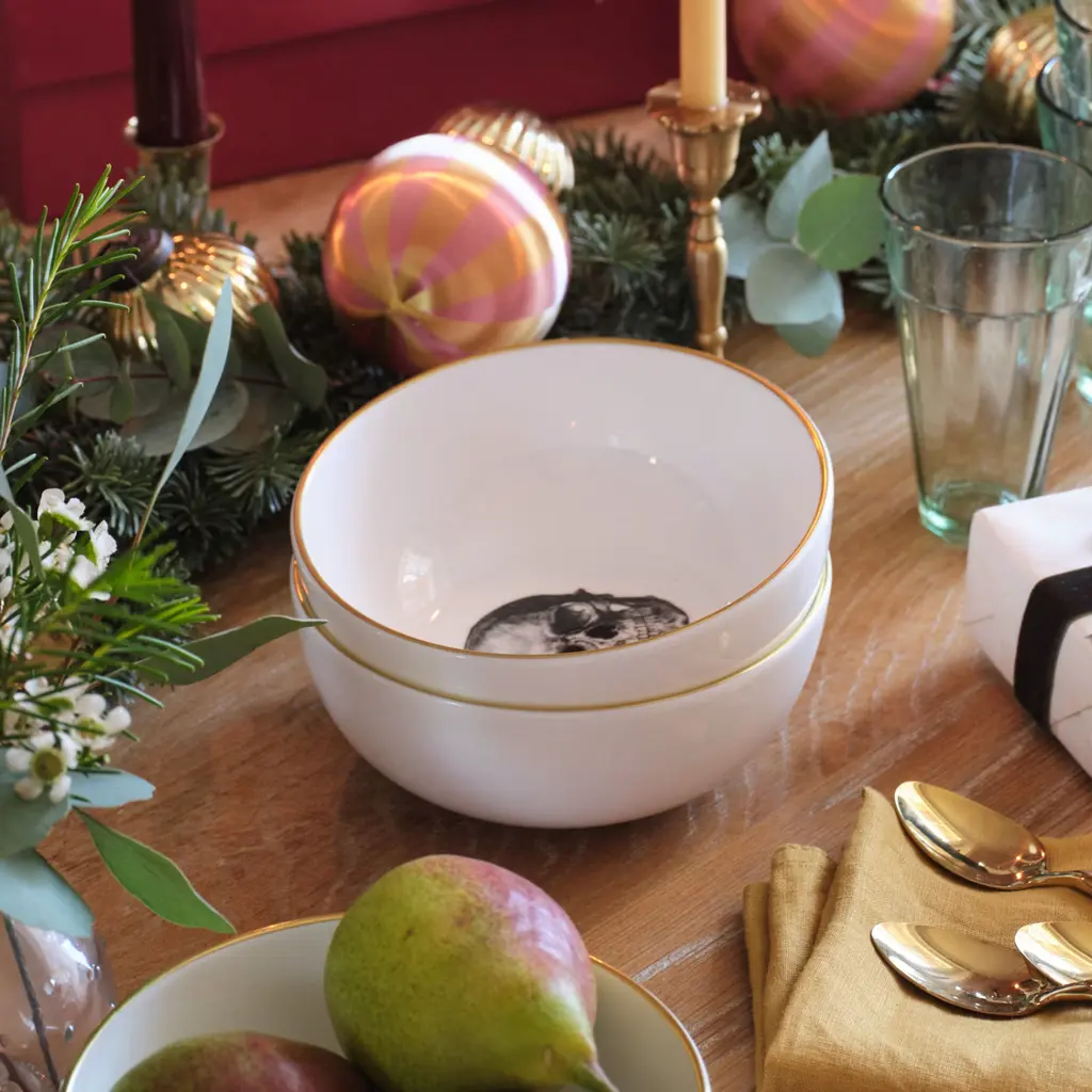New from Melody Rose, a set of two exquisitely handcrafted fine bone china cereal bowls featuring the Skull design.Measuring 14cm wide x 6cm deep, the new bowl shape with ‘higher’ sides is a perfect breakfast bowl. Use for cereal, fruit and yoghurt, ice cream or of course whatever takes your fancy.Designed with versatility in mind, the elegant and modern shape bowls are handmade in Stoke-on-Trent, England's pottery heartland. Each bowl is edged with hand painted 22kt burnished gold for a luxurious and dishwasher friendly finish.The playful design paired with the best of British craftsmanship makes the set of two bowls the perfect gift for foodies, design lovers and everyone in between.