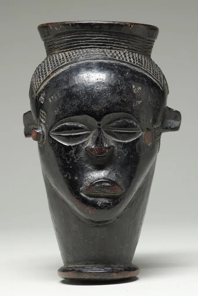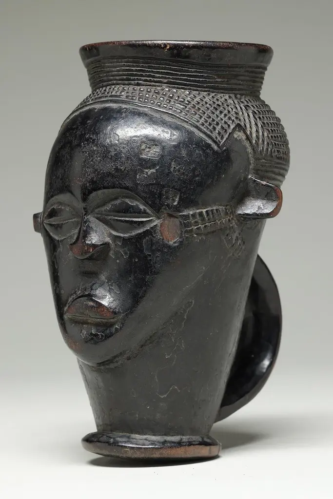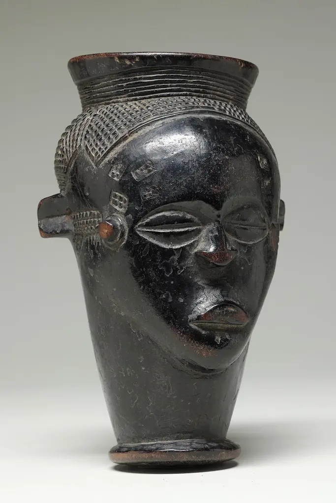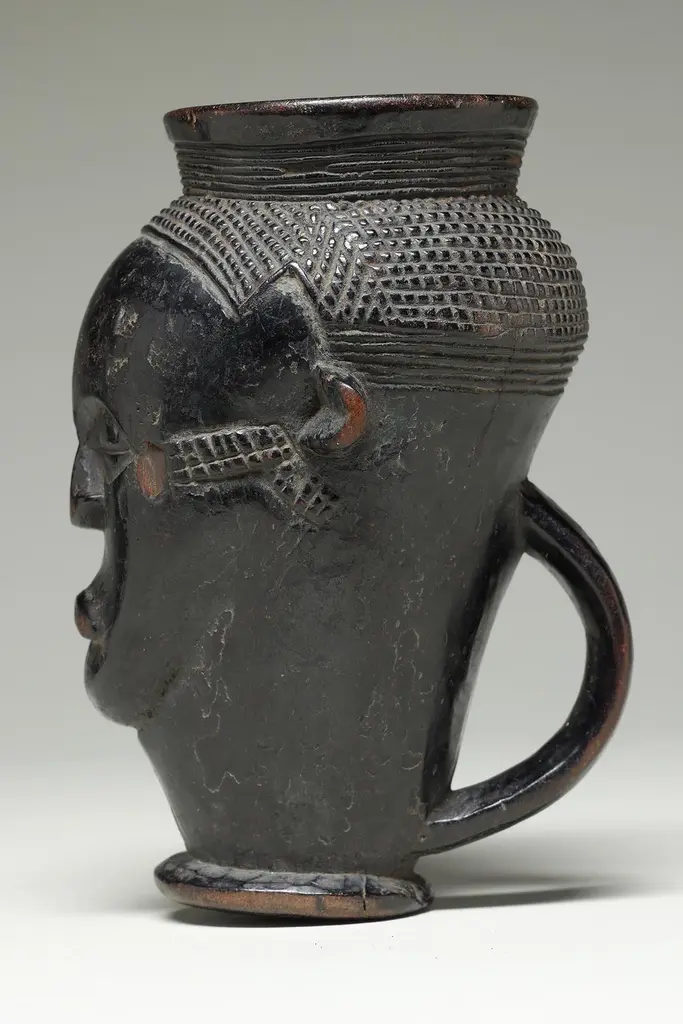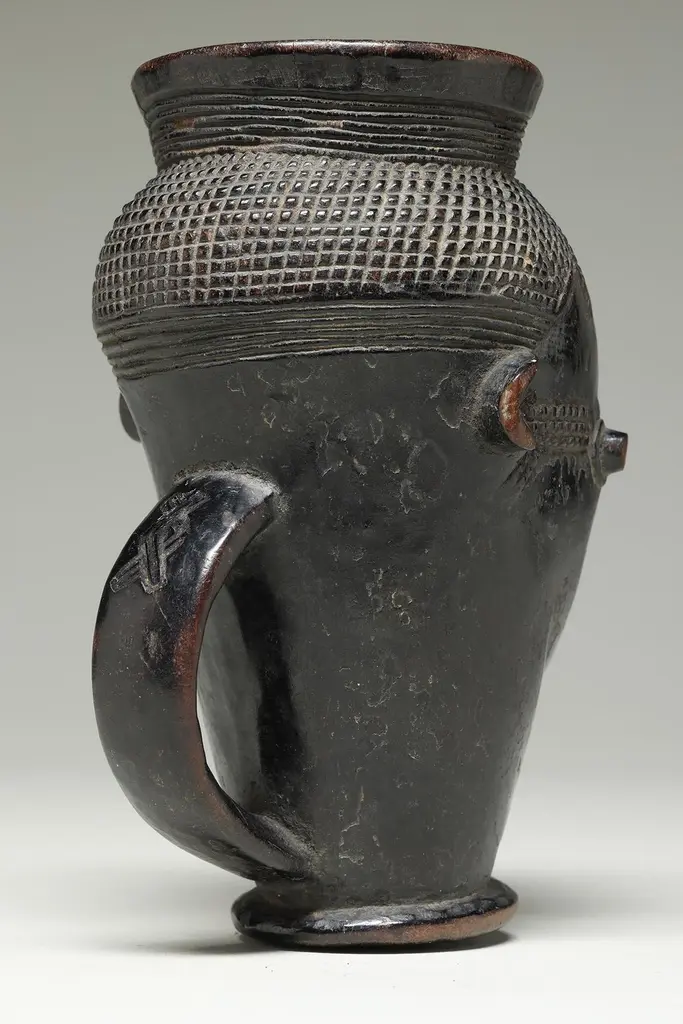 Small early Kuba Cup With Sweet Face, Fine Hair, Handle DRC, AfricaFinely carved hair in tight geometric form, small projecting ears. Some damage and wear to lips, and keloid on proper left side of face missing.It is in good condition with wear, polish and erosion from traditional use, appropriate for its age, use, and medium. Scuffs and nicks here and there. Age, wear and staining inside. Early to mid 20th century,