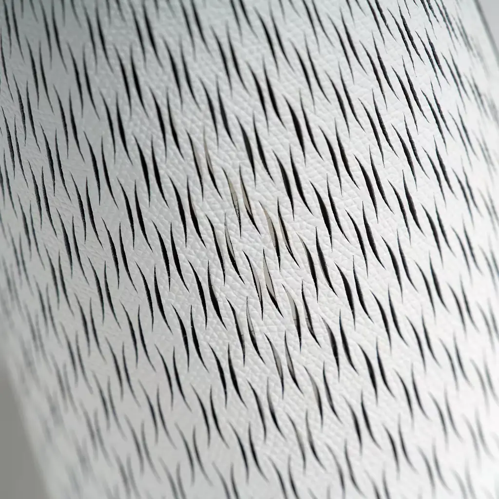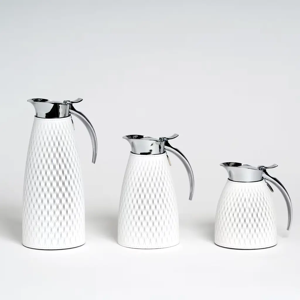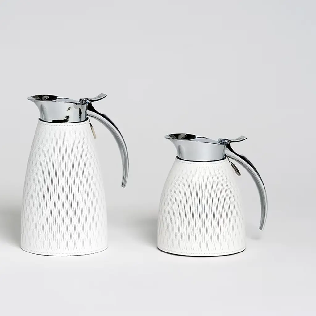 Stunning in its simplicity, this refined thermal carafe is an essential addition to a modern kitchenware collection. Crafted entirely of metal, the carafe features a round base that tapers to a narrow top and spout, the curved handle accentuating the sleek geometry of the body, which has a removable leather cover with a zip, allowing for easy removal and wash. The cover's distinct surface texture is achieved with laser, by making a series of cuts on the surface of the leather. A lavish way to serve coffee, this carafe will be a captivating addition to any table setting. Can hold 300ml.