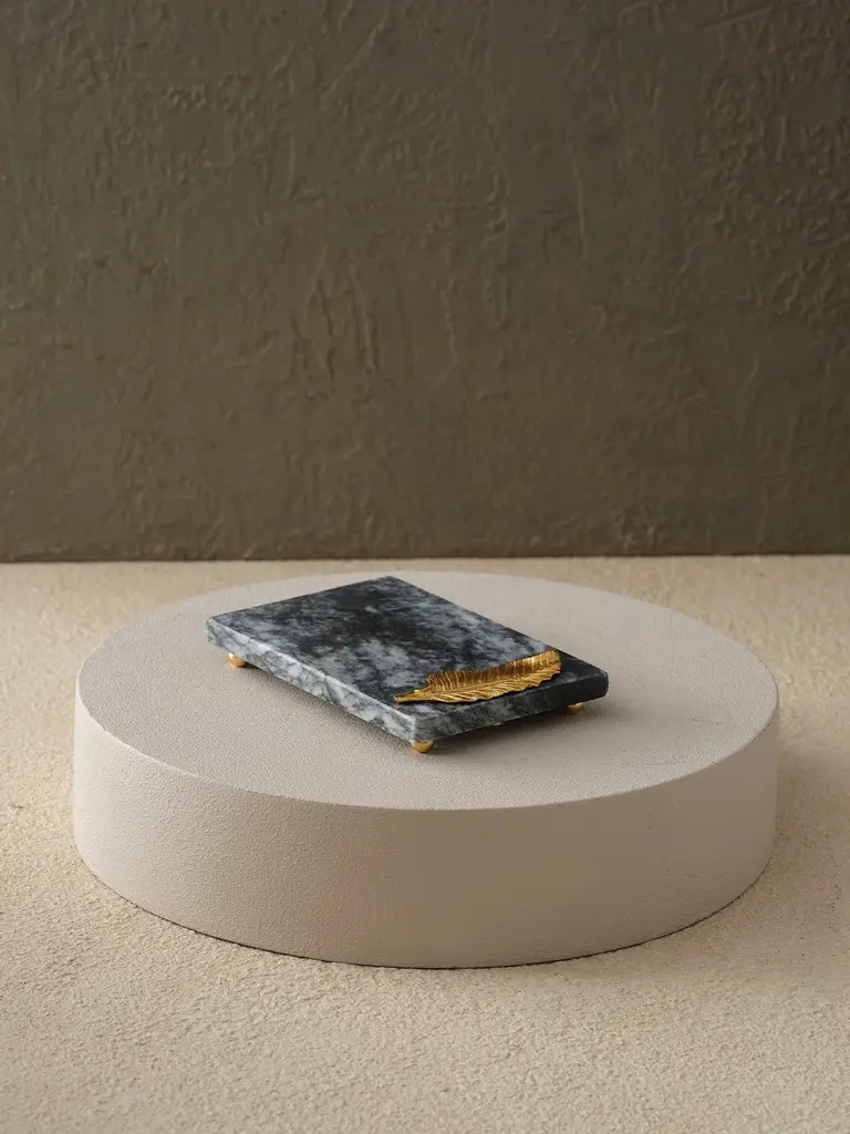 Natural elegance meets contemporary refinement in the Grey Marble Rectangular Serving Board With Gold Leaf Accent. Crafted from richly veined grey marble, this compact serving board is elevated on gold-toned feet and adorned with a sculptural gold leaf detail — adding an organic touch to its clean, rectangular form.Perfect for serving bite-sized treats or used as a decorative platform for candles, perfumes or jewelry, it’s a beautiful blend of nature-inspired design and timeless luxury. A subtle statement piece that elevates everyday rituals.
