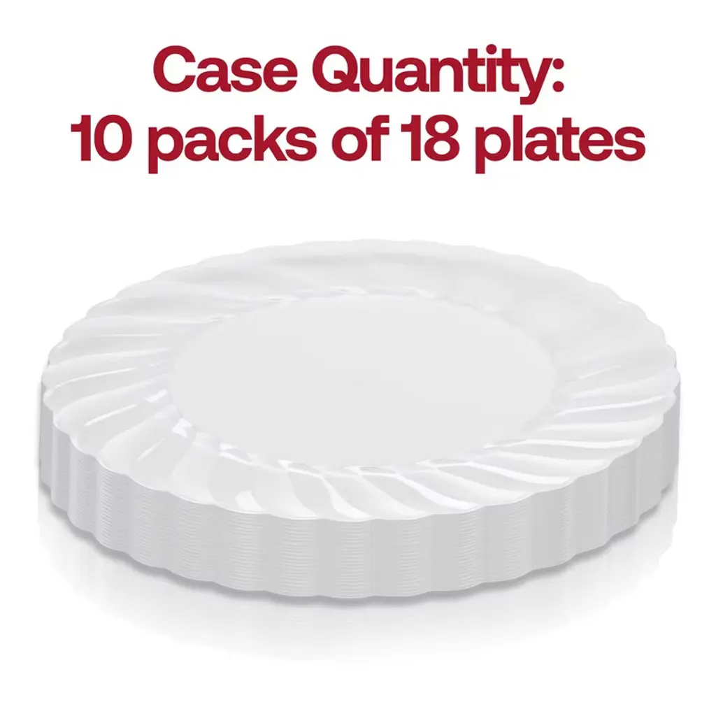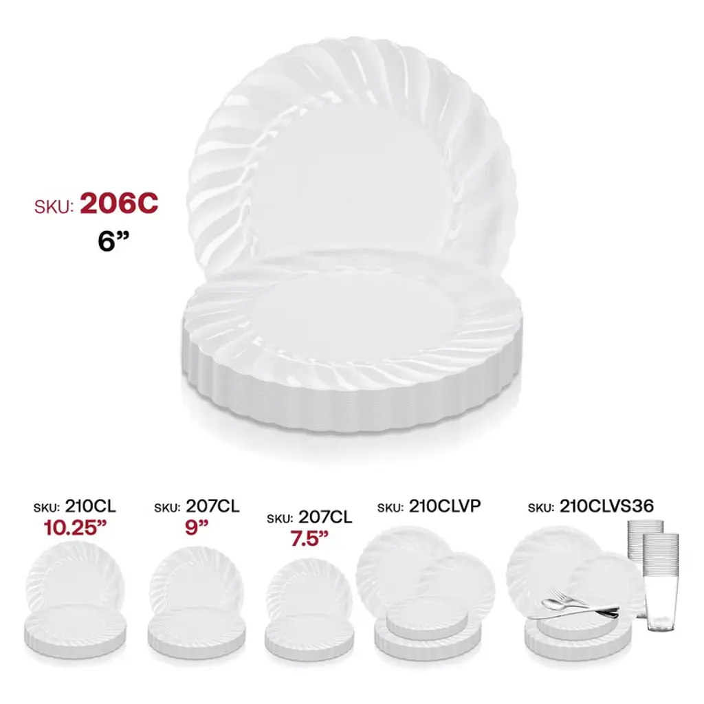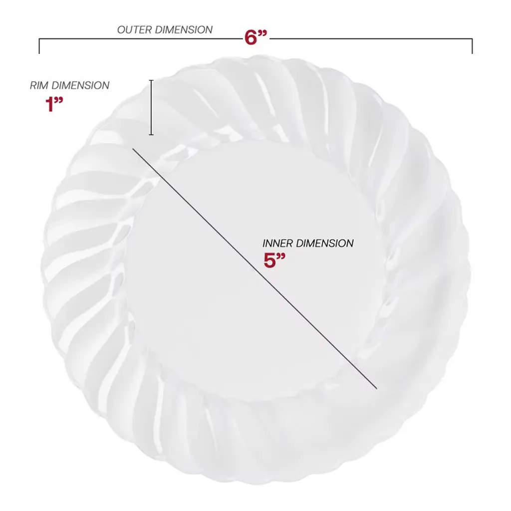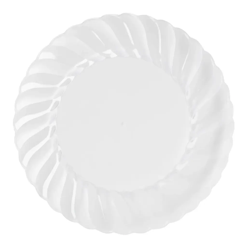 Let your party planning skills shine with these beautifully designed disposable plastic pastry plates. These stylish disposable plastic pastry plates take your everyday table to the next level. They are perfect for any occasion. With the contemporary clear flair design, they are sure to complement any table setting. Also, because they are disposable, you don't have to worry about making a mess with food or dishes.