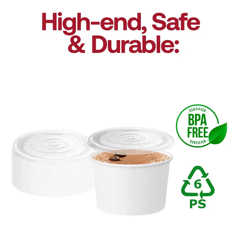 Case Quantity: 1000 Cups and 1000 Lids Cups Color: White Lids Color: Clear Shape: Round Cups Material: Paper Lids Material: Plastic Disposable: One-time, single party use Lid Recycling code: #1 PET (Polyethylene Terephthalate)
